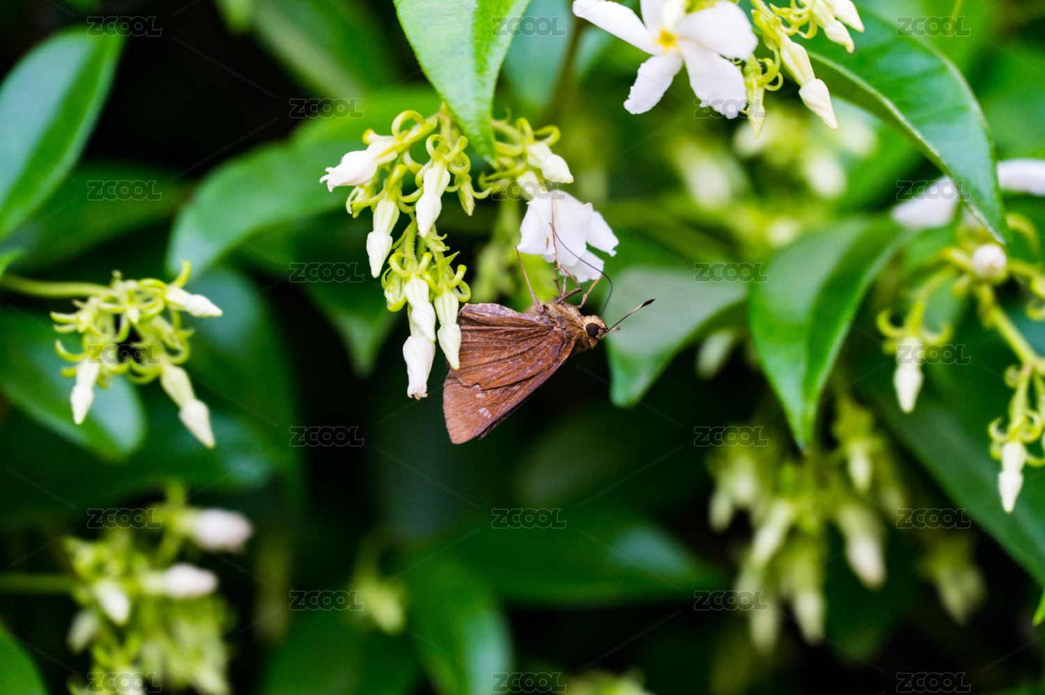飞在绿叶白色小花上黄色带着黑色斑点的蝴蝶