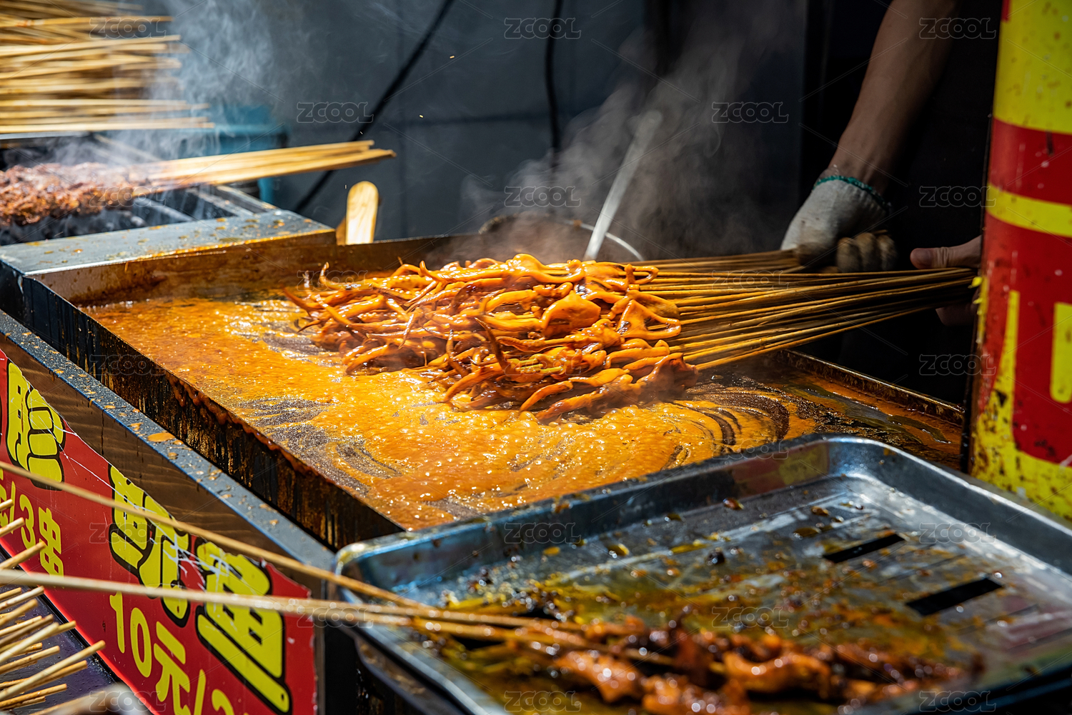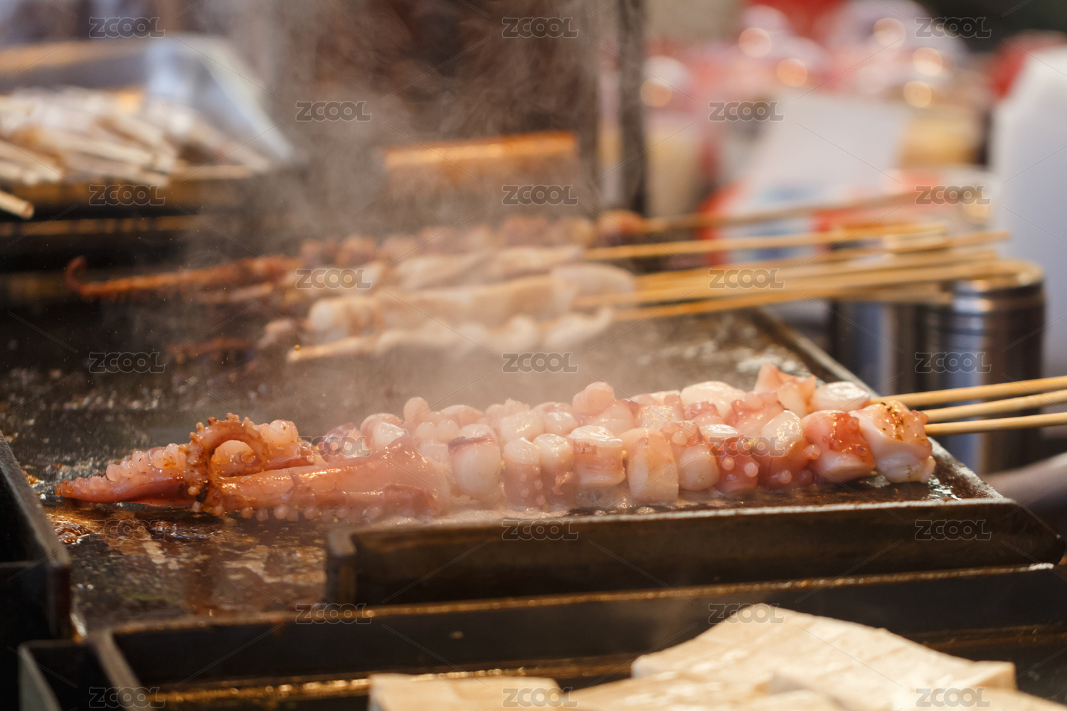 炉上冒热气的铁板鱿鱼串