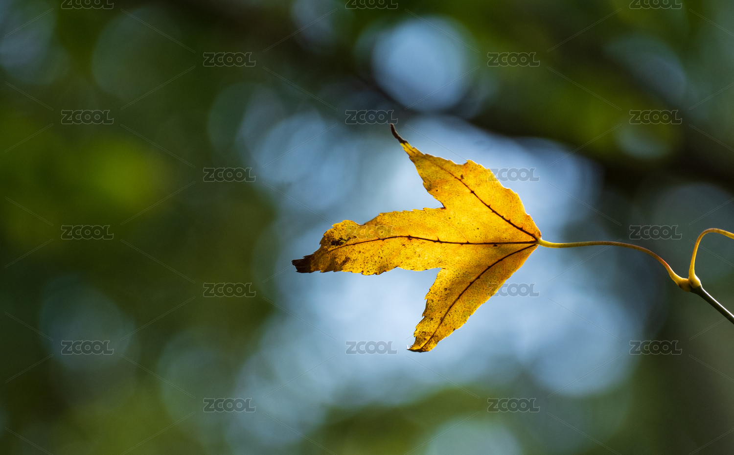 深秋逆光照耀下晶莹剔透的金黄色枫叶