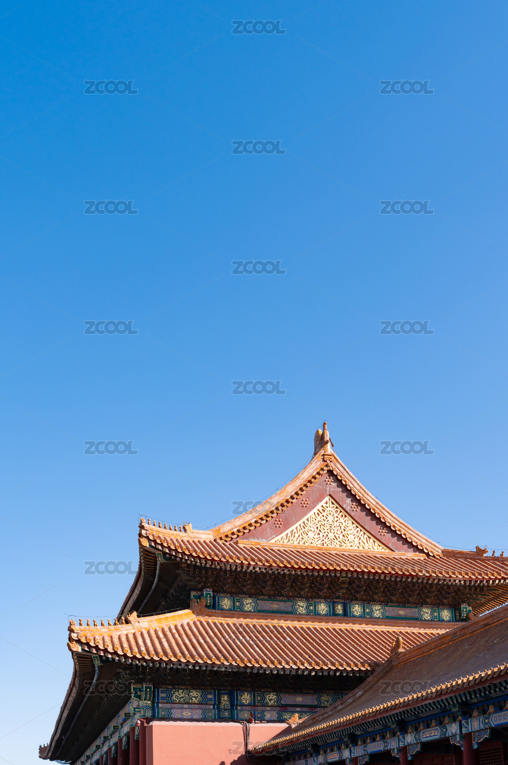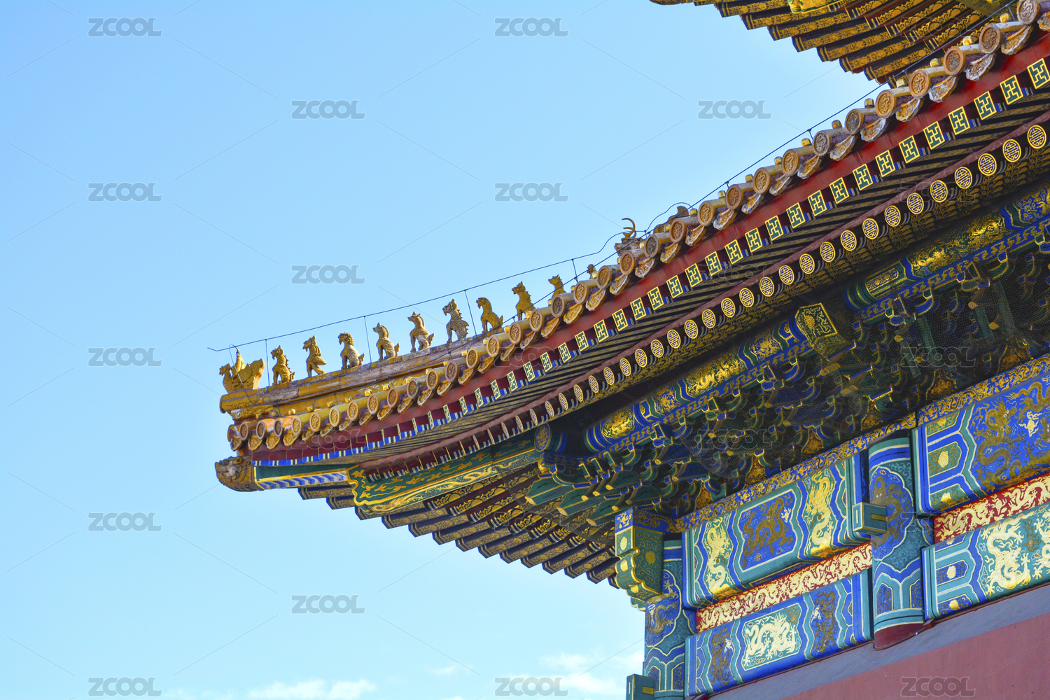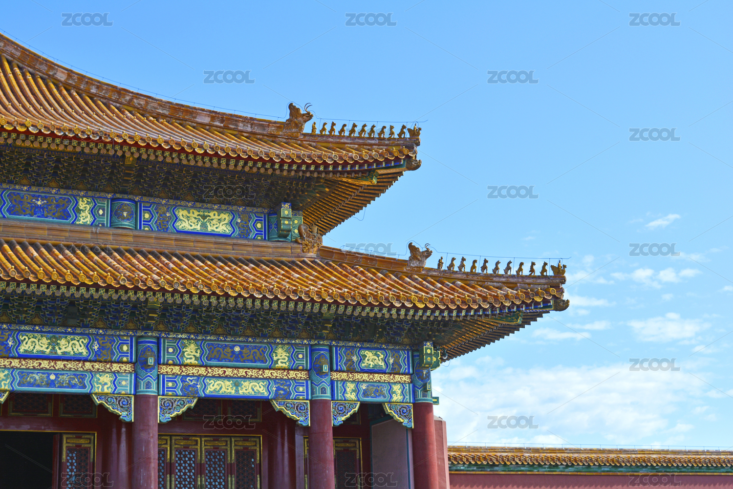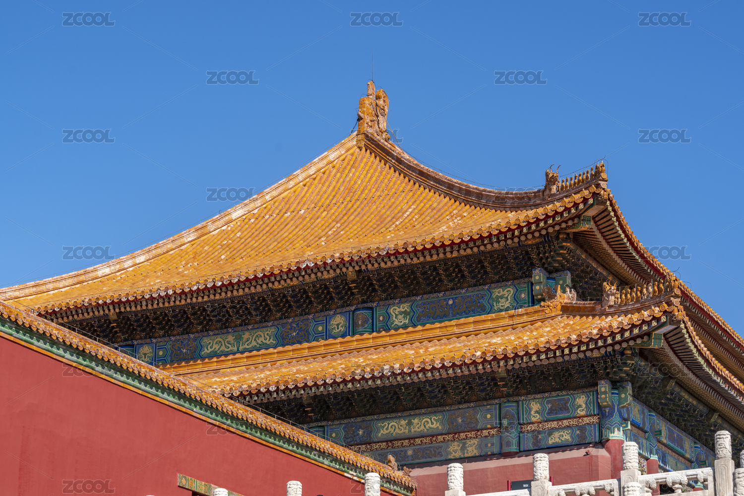 中国北京故宫博物院古建一角——琉璃瓦屋顶飞檐瑞兽
