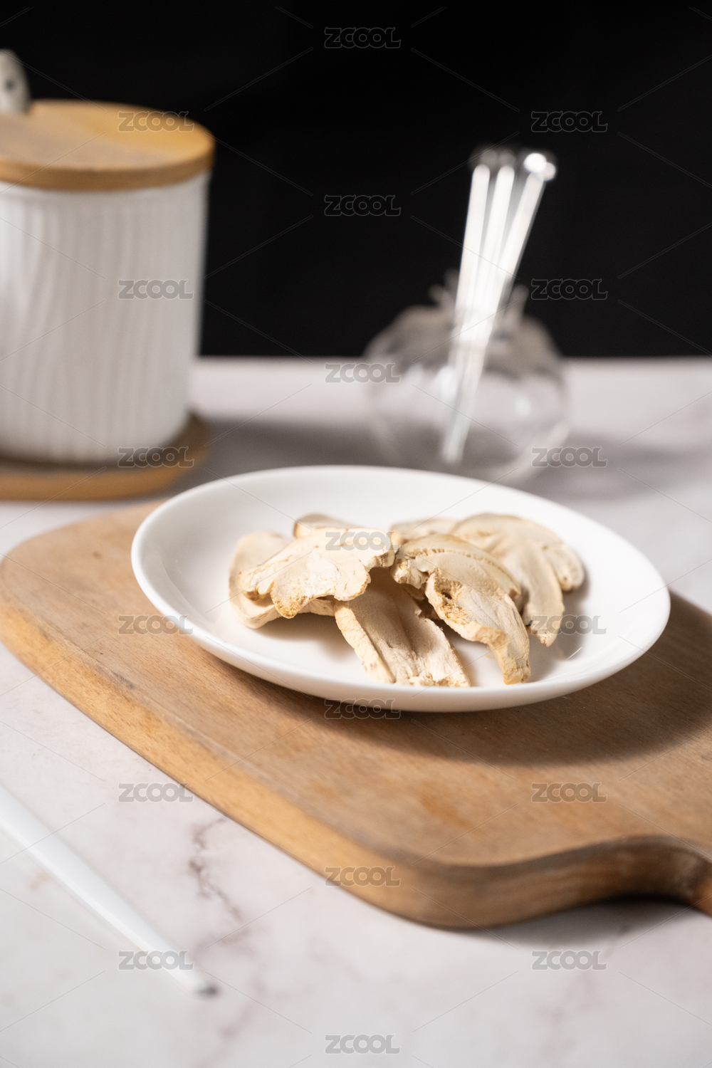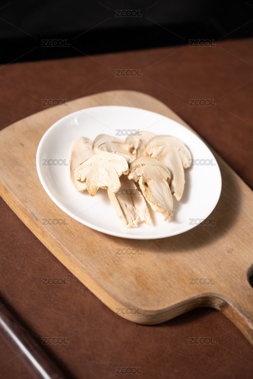 桌面上的盘子里的美味可口的干松茸