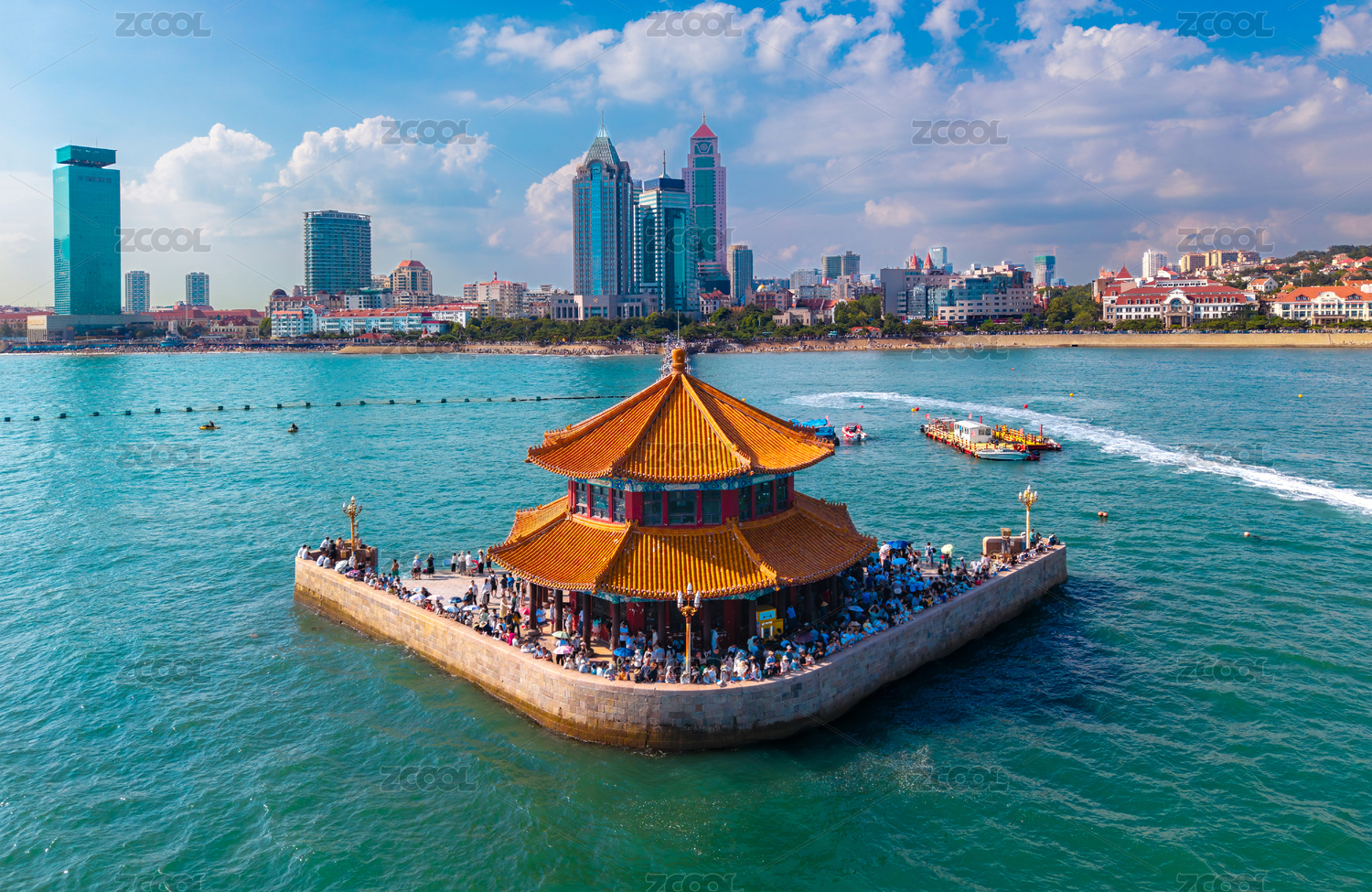 中国山东青岛栈桥回澜阁和城市天际线航拍