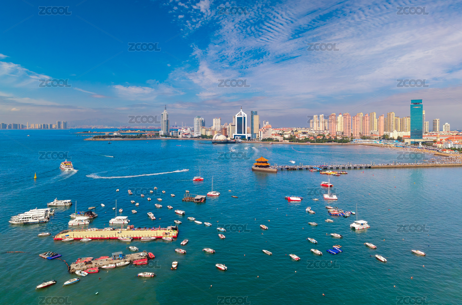 航拍中国山东青岛湾栈桥风光和现代建筑