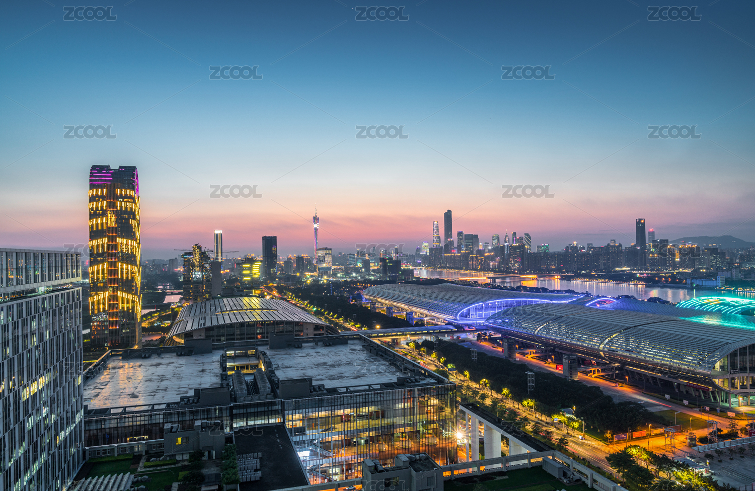中国深圳市福田会展中心与平安金融中心的多云黄昏