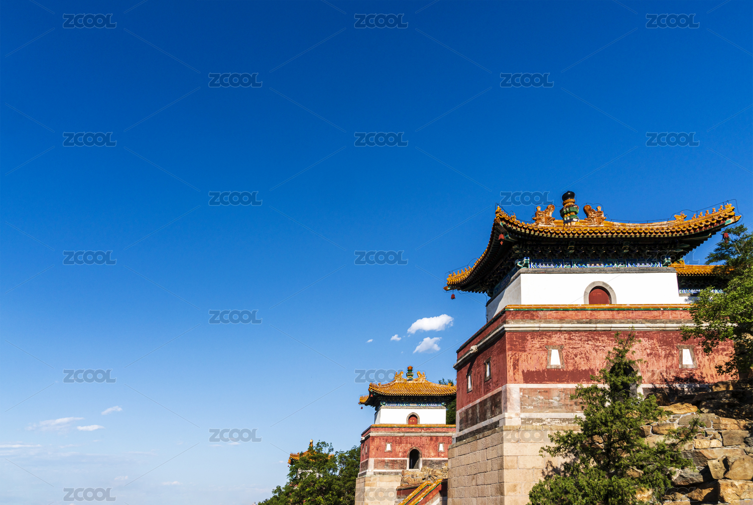 秋天蓝天下的北京颐和园公园的亭台楼阁古建筑