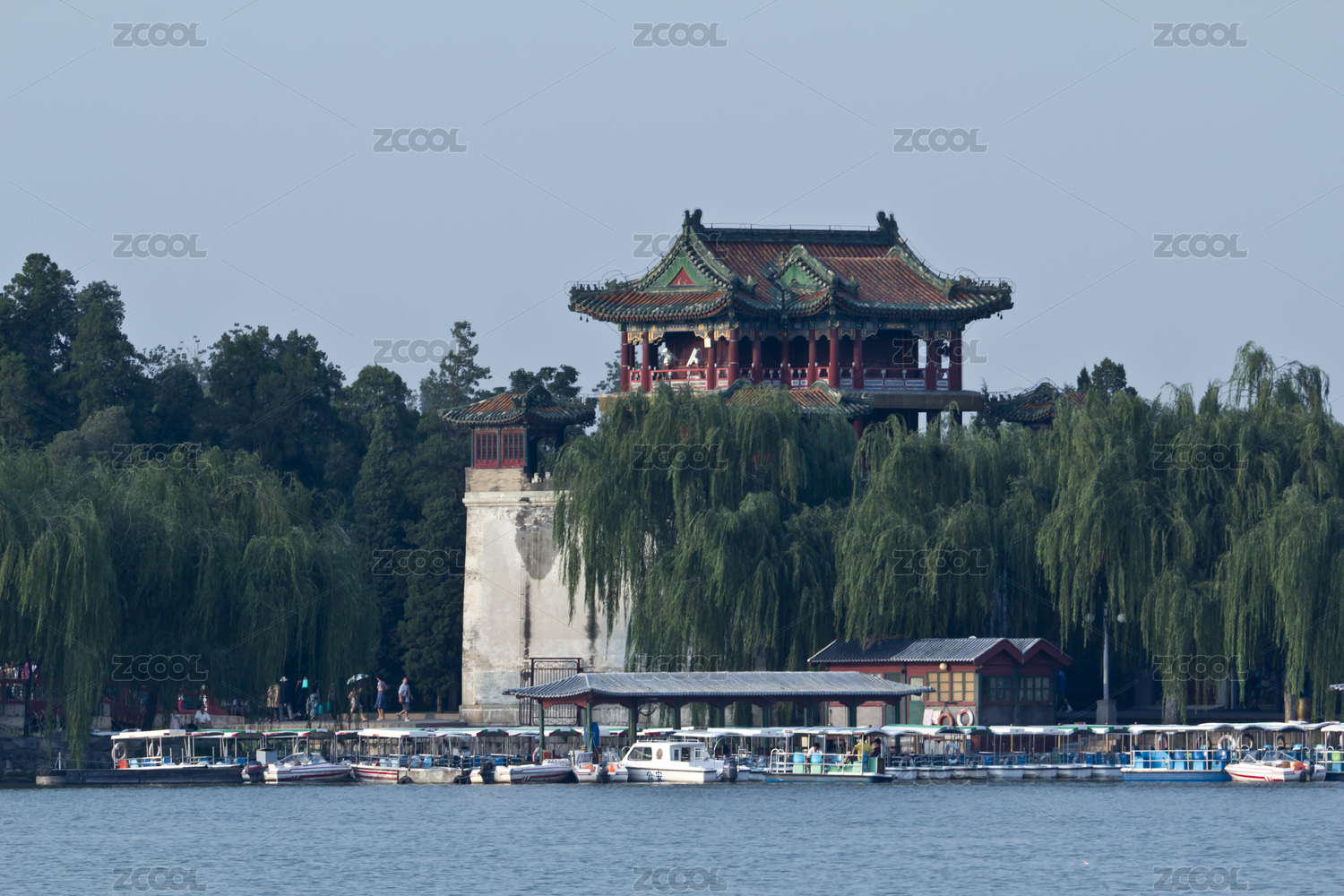 秋天夕阳下的北京颐和园公园的昆明湖的古建筑
