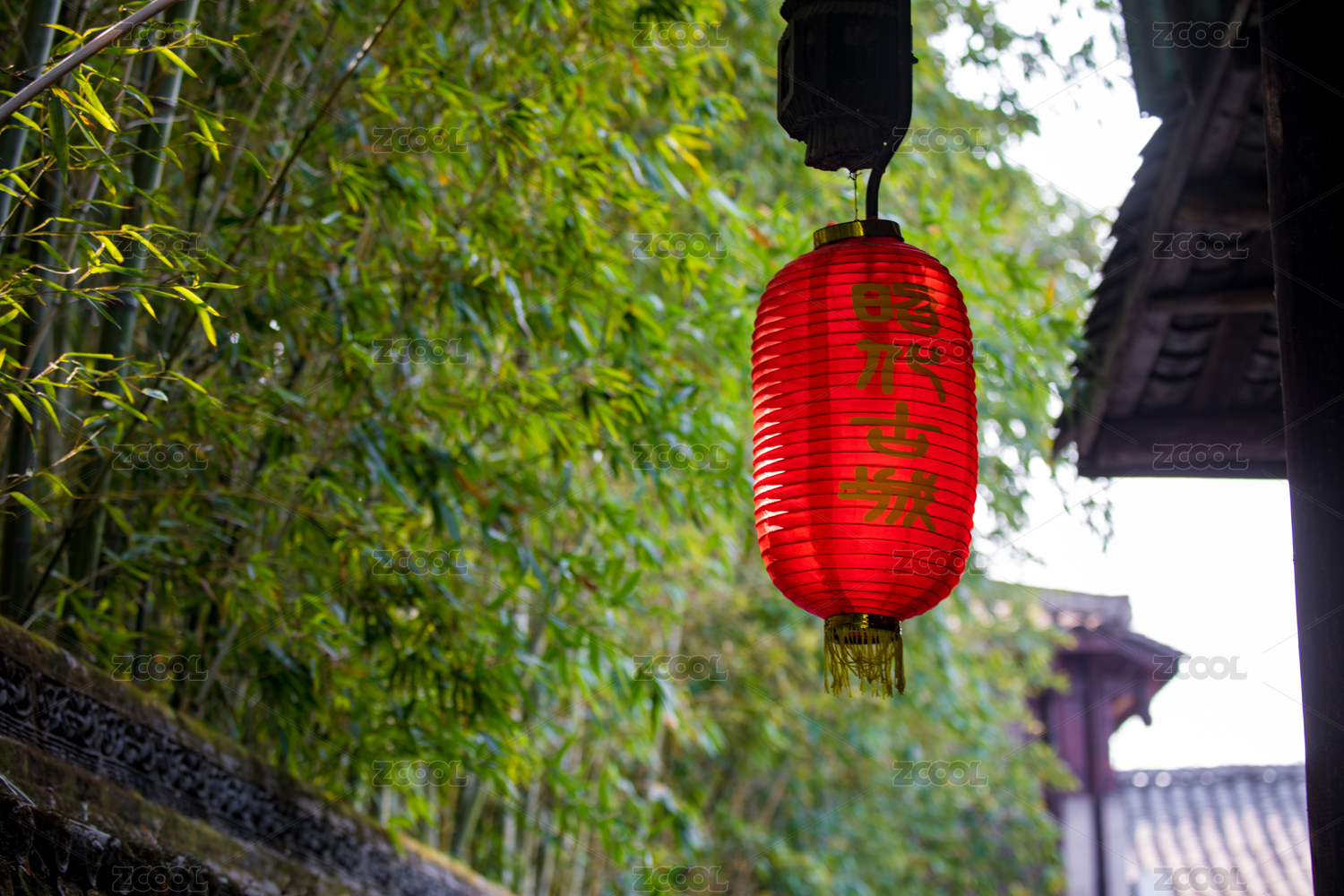 传统的红灯笼悬挂在绿树环绕的历史悠久的屋