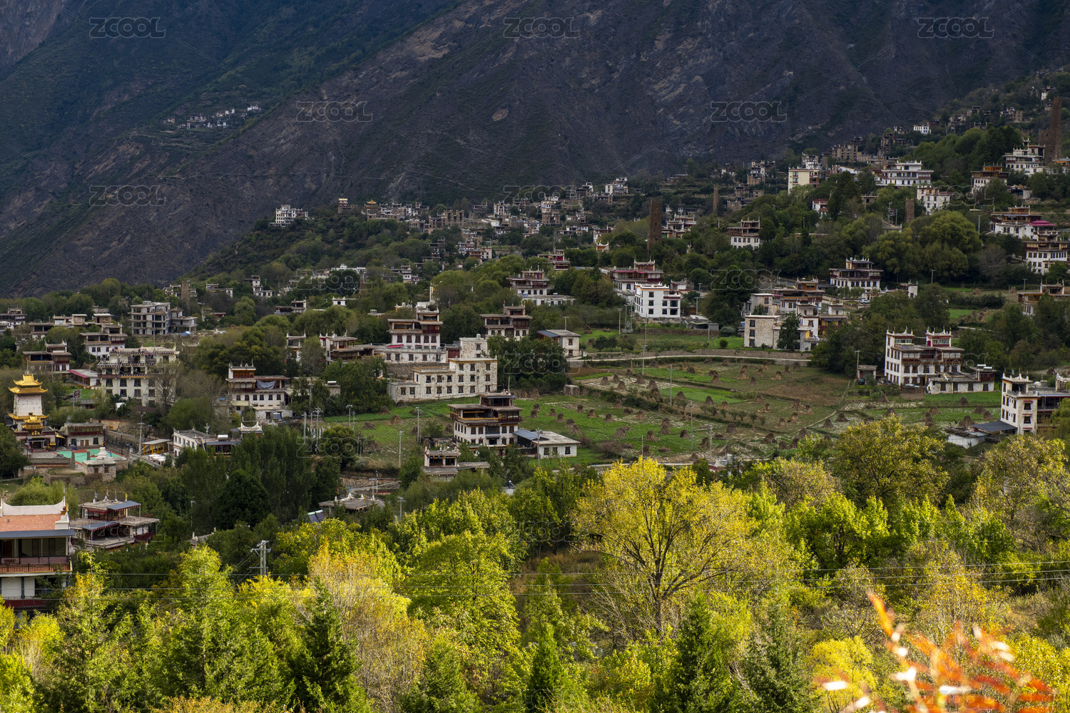 中国四川甘孜丹巴中路藏寨的民居和彩林秋色