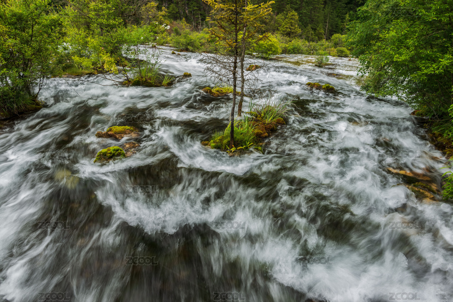 九寨沟珍珠滩溪流与苔藓覆盖的枯木