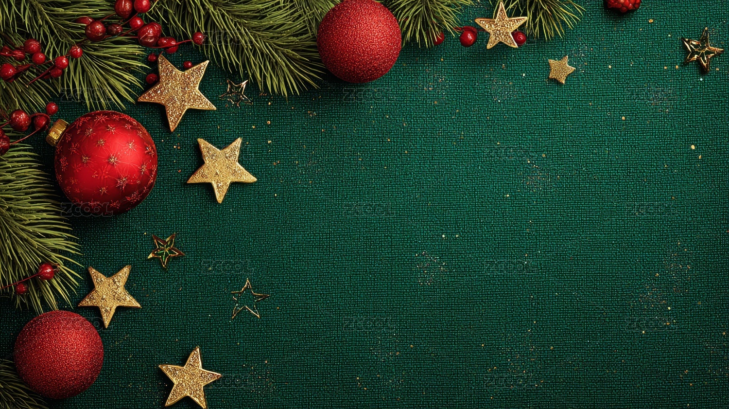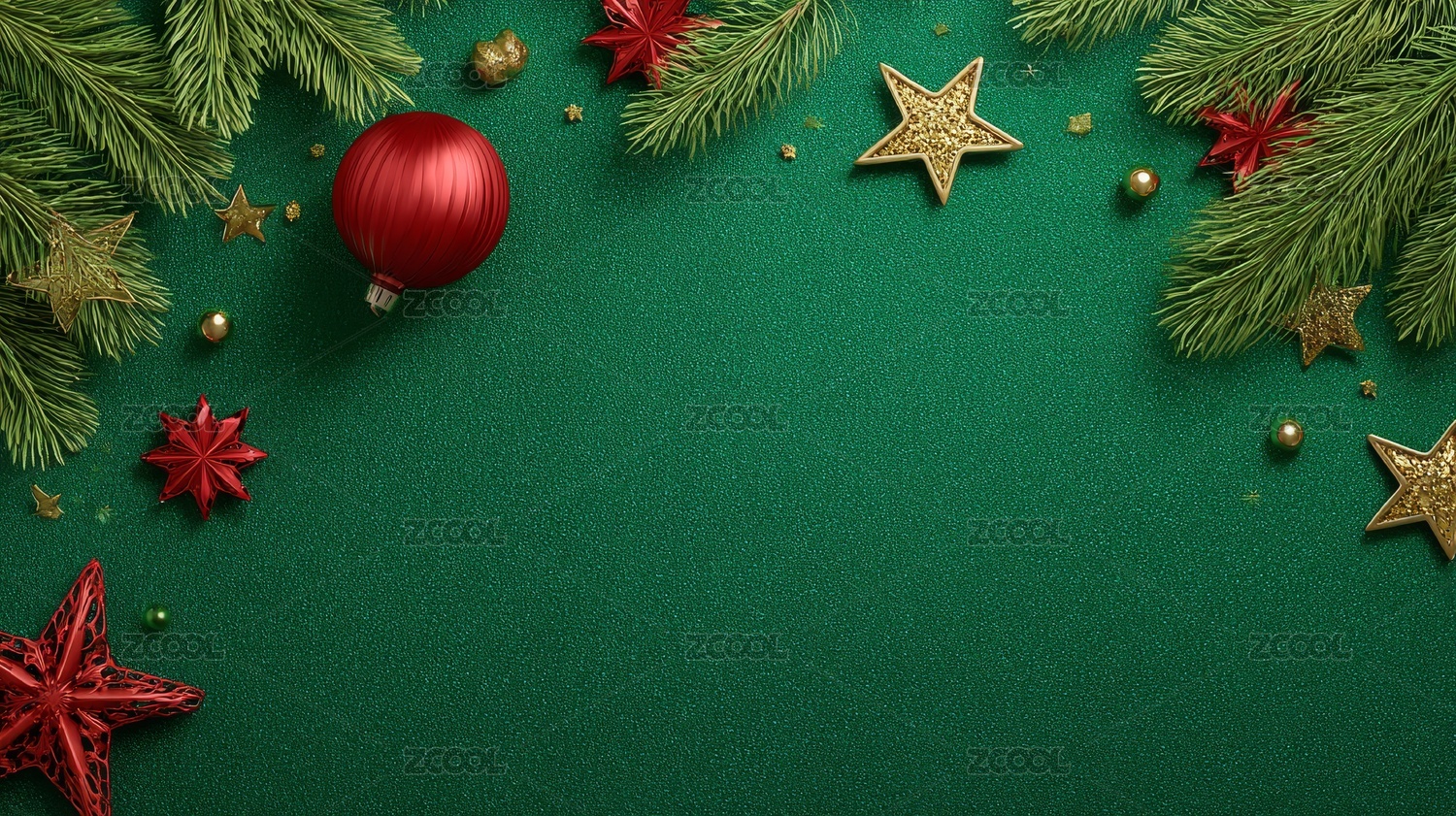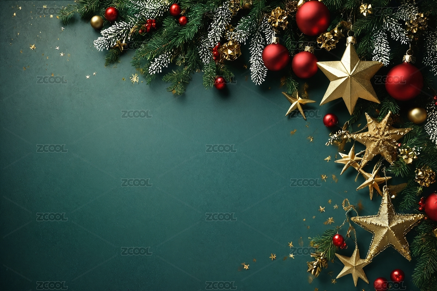 圣诞,装饰,绿底,红色,金色,圆球,星星,松枝,松针,节日