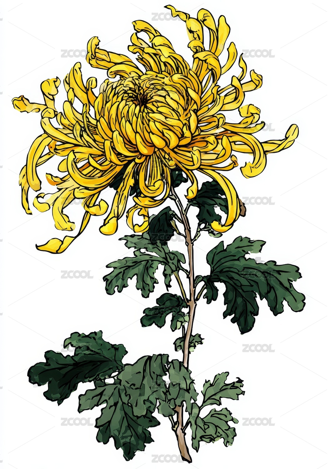 水彩,风格,菊花,橙黄,花瓣,花朵,枝叶,蓝绿,色调,绘画