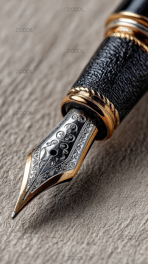 钢笔,笔尖,金属,精致,雕刻,花纹,复古,金色,黑色,笔触