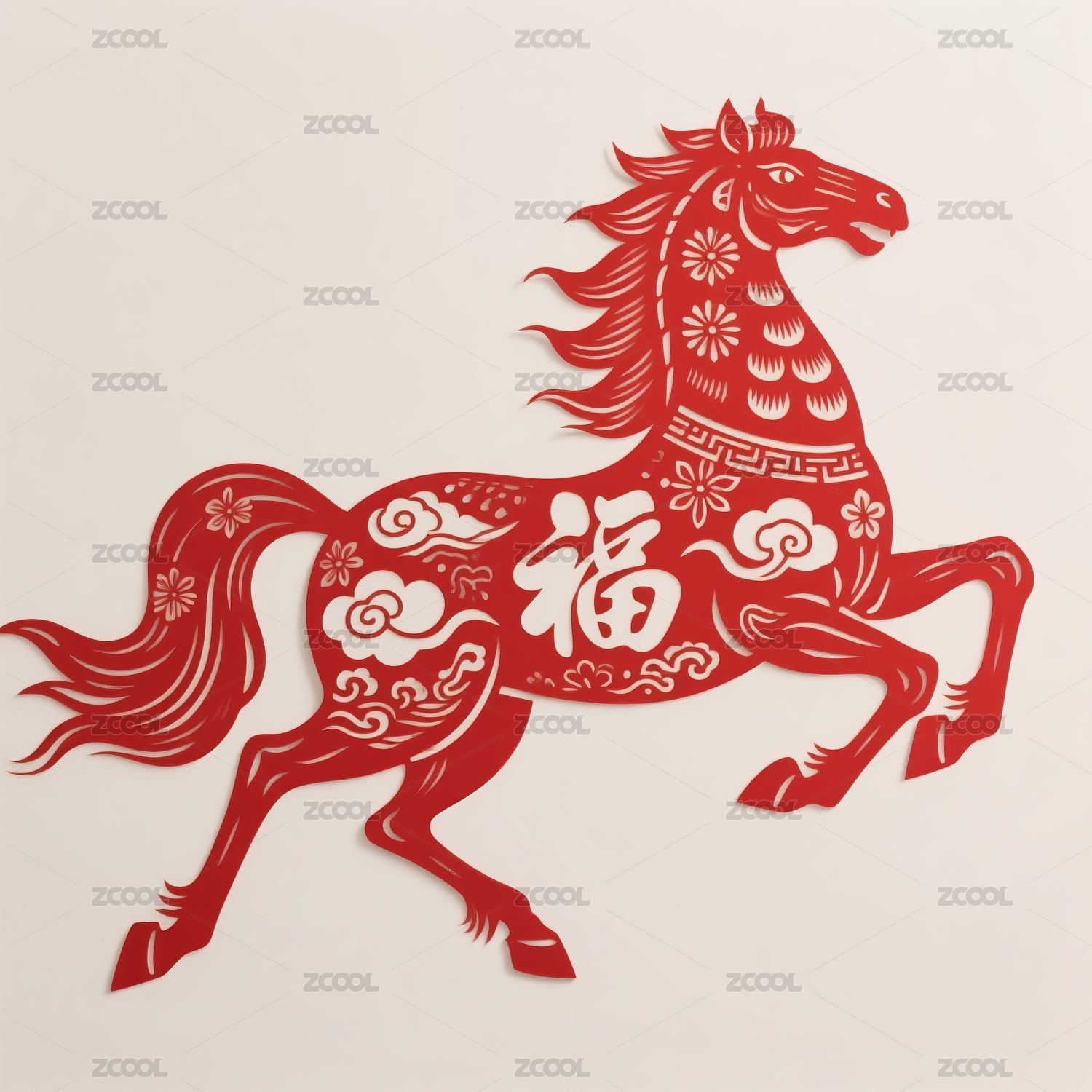 金色骏马剪纸配祥云红底图案