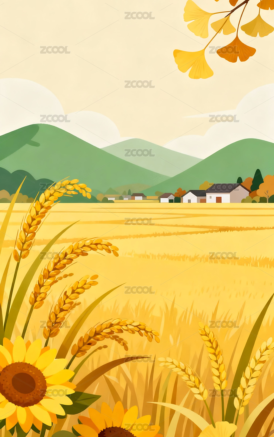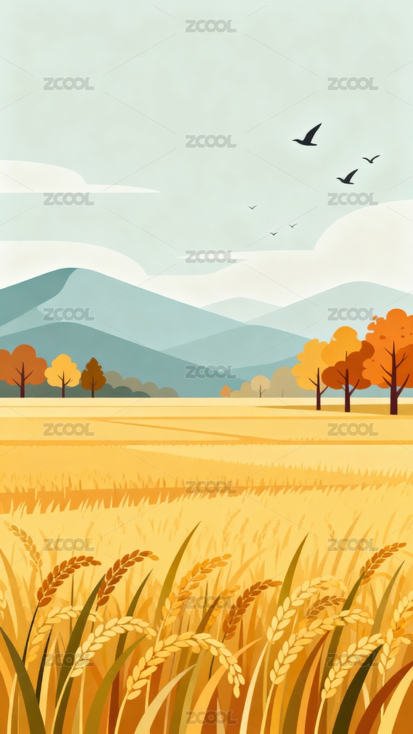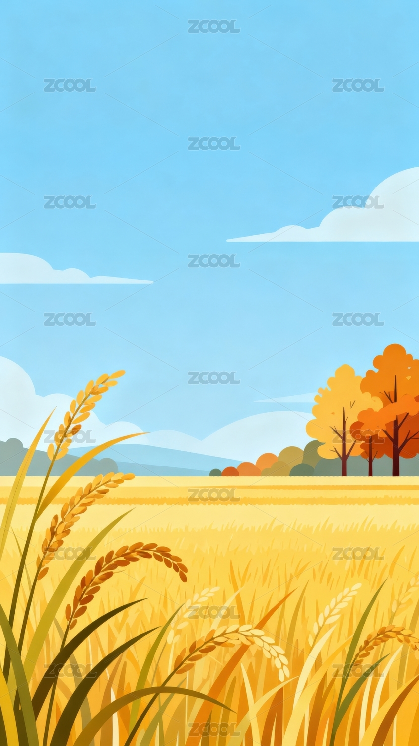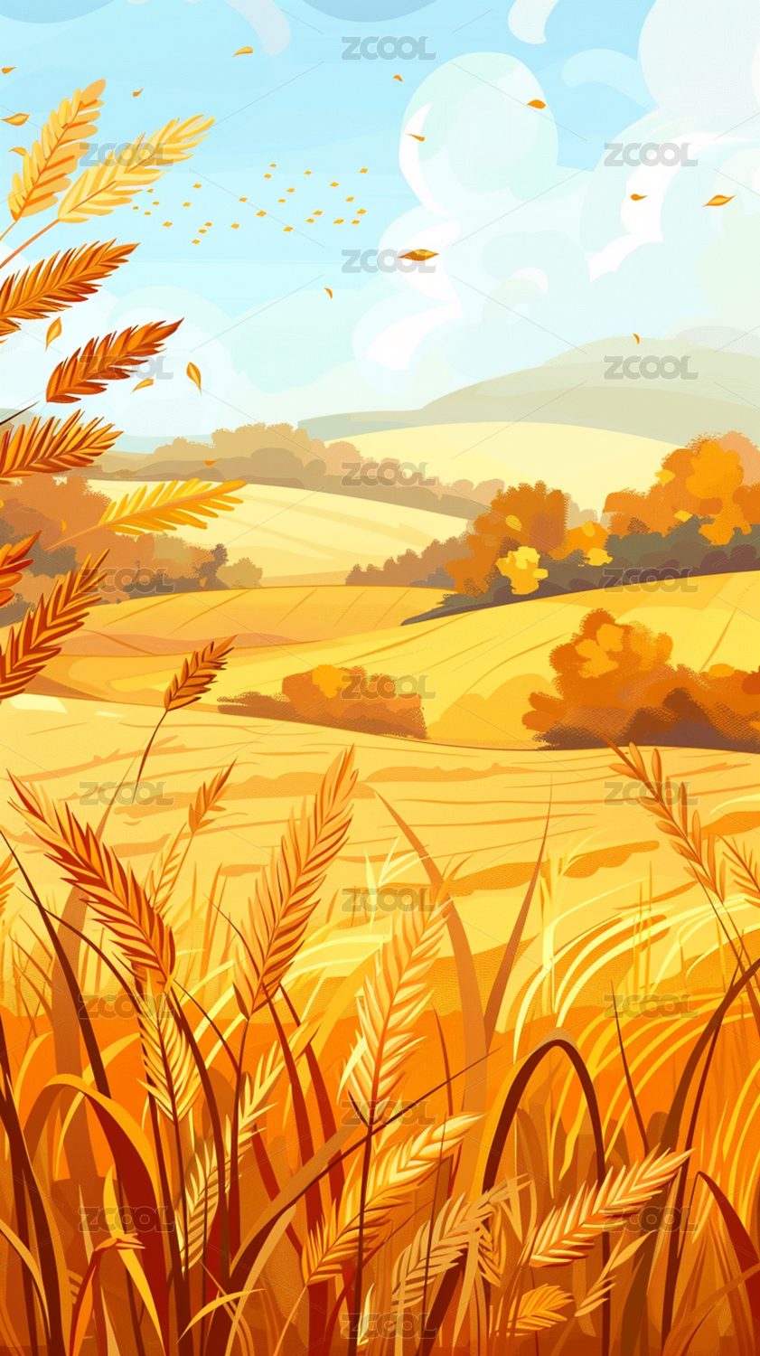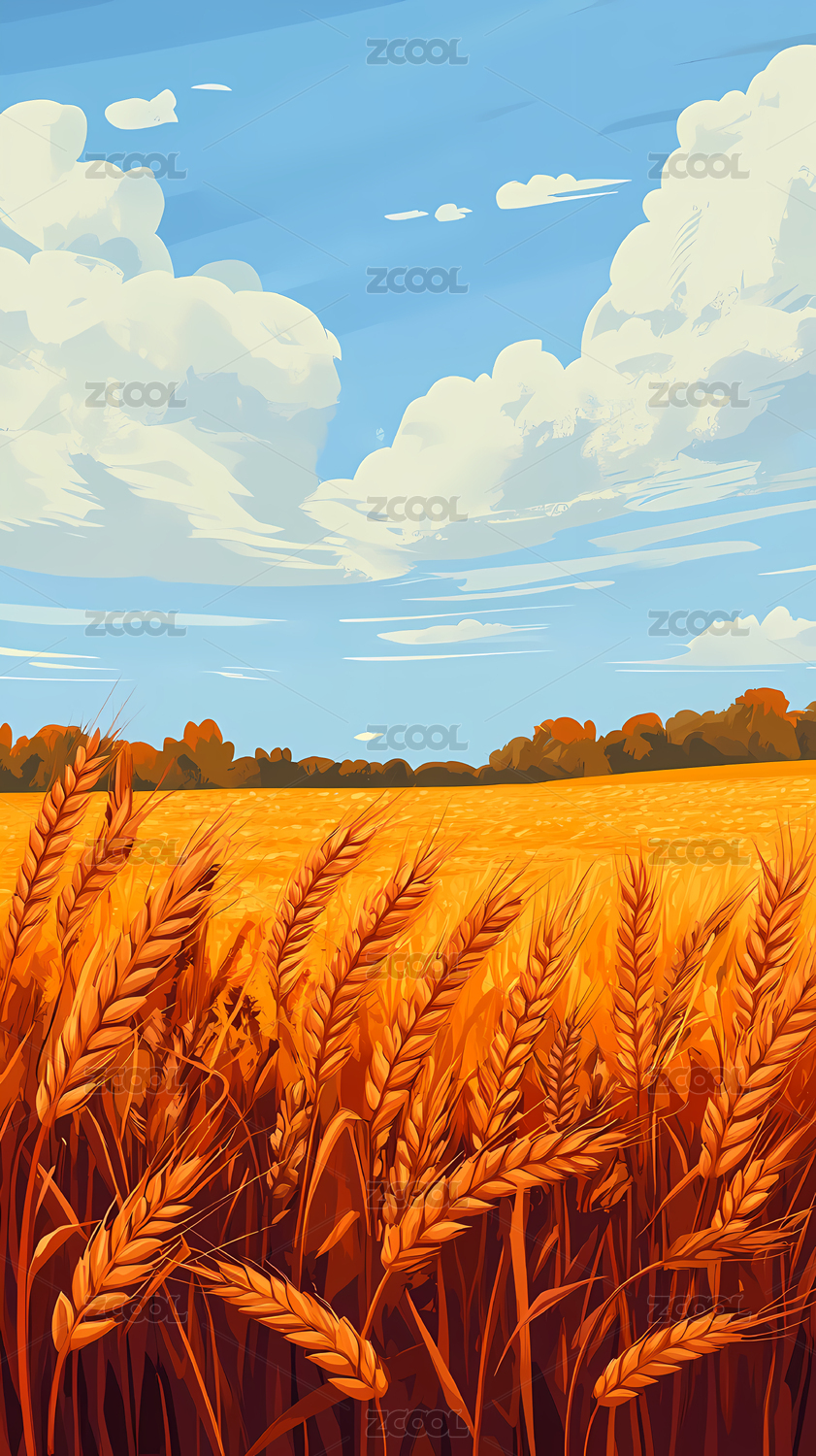 夏天晴朗天空下成熟的金黄色麦田插画绘画