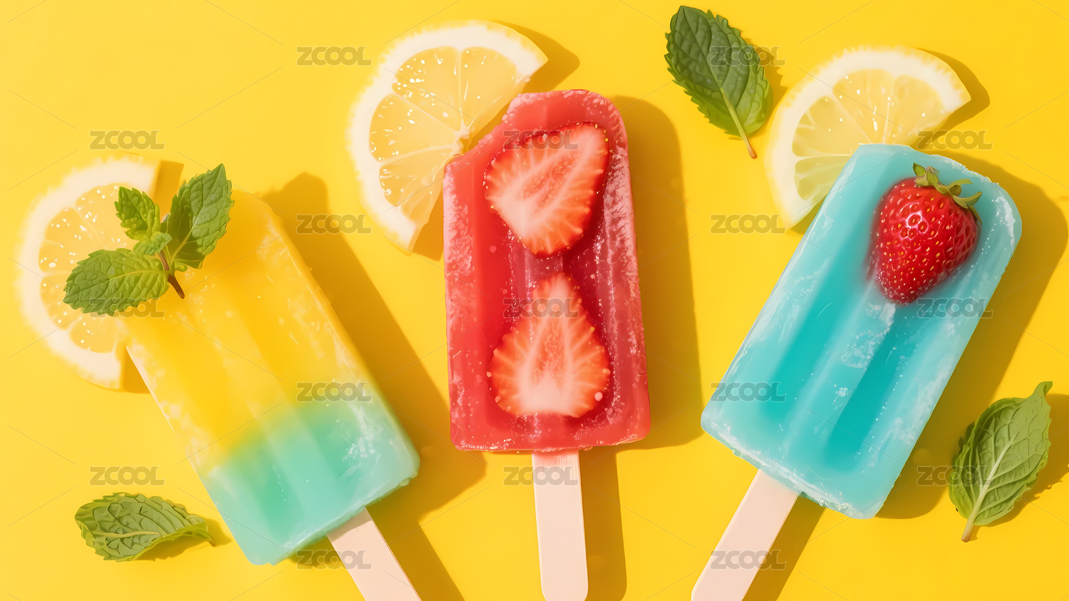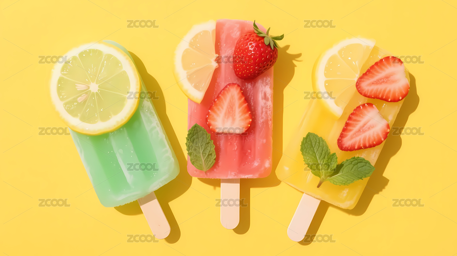 草莓柠檬冰棒黄背景
