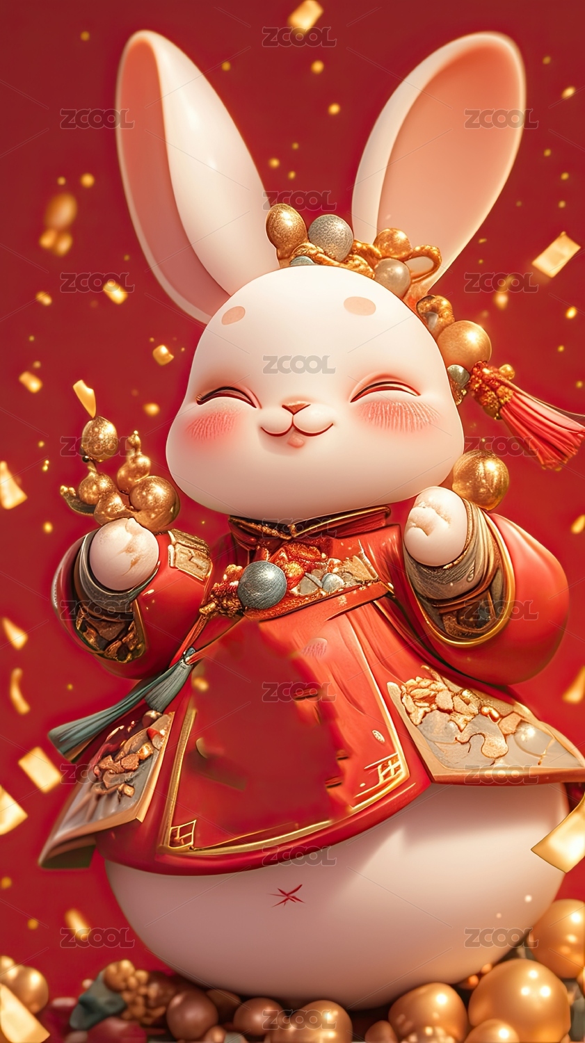 3d 渲染的立体兔子拿着红色灯笼祝贺新年