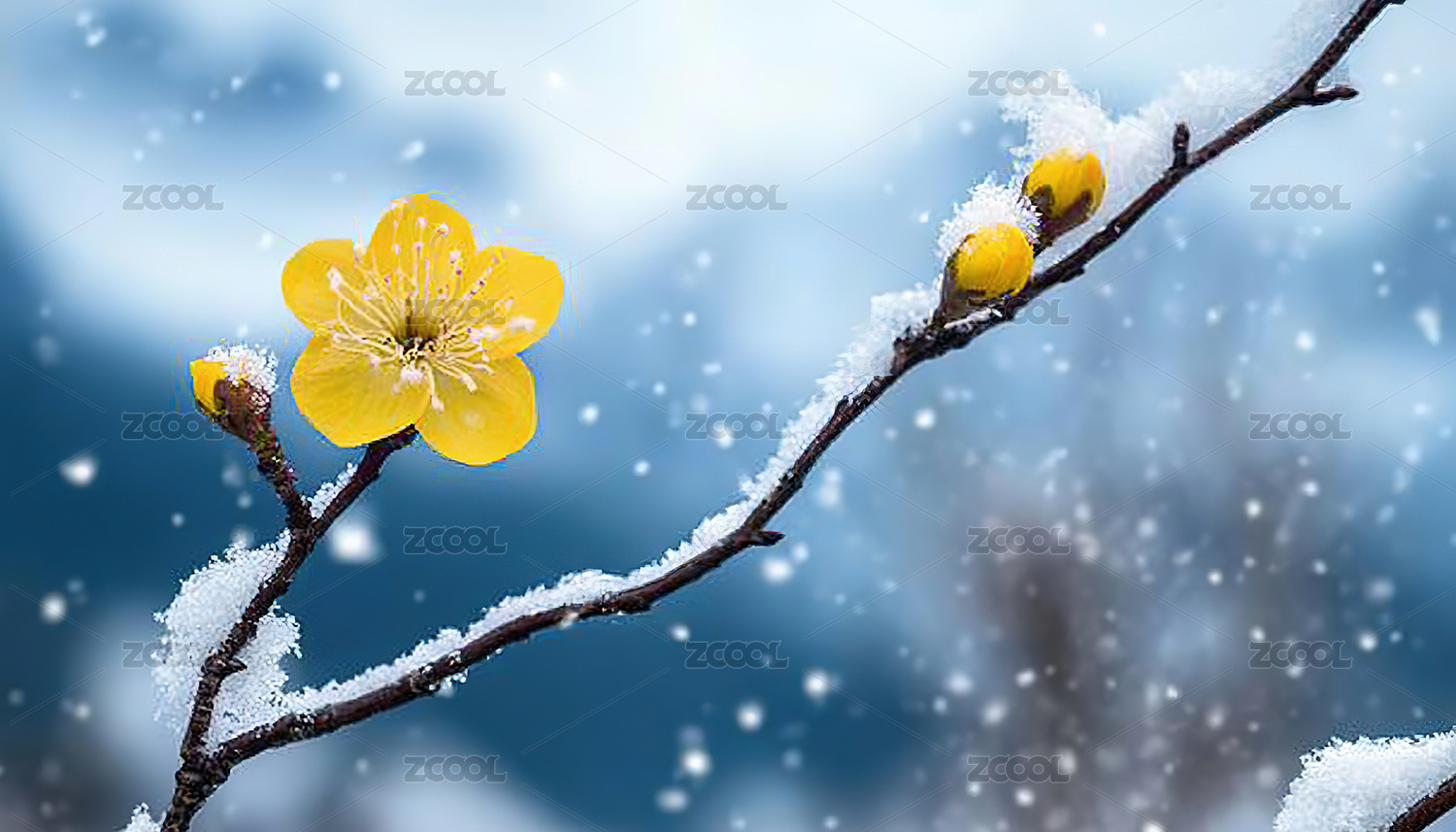 雪枝上腊梅绽放的清新雅致冬日花卉画面