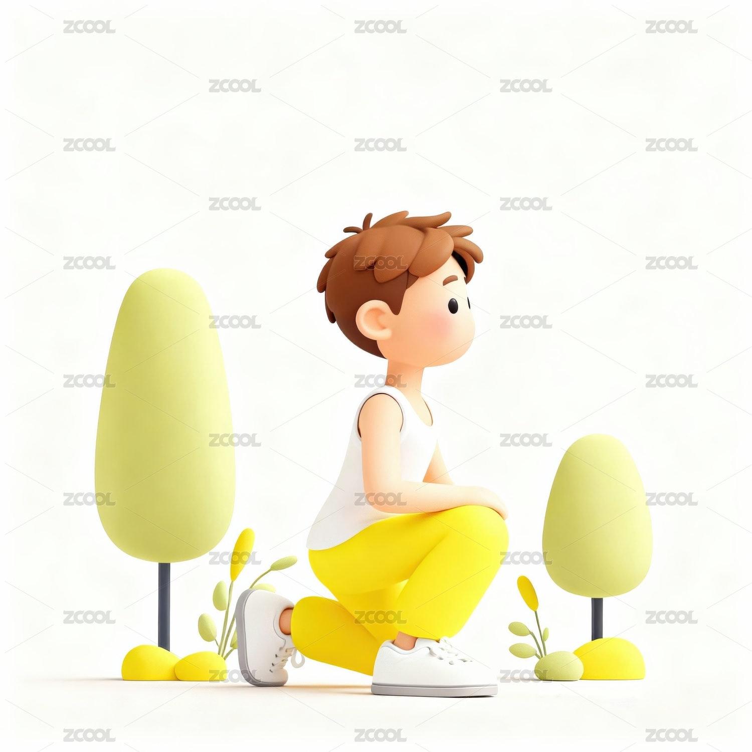 卡通男孩蹲坐树旁场景