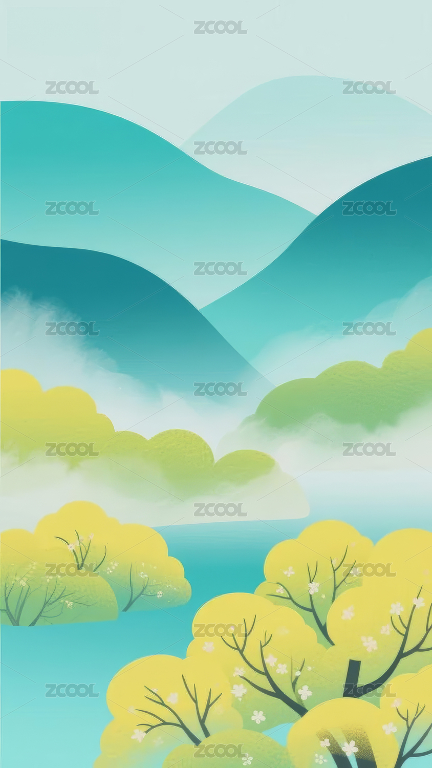 淡彩水墨国风山水系列之春夏翠绿