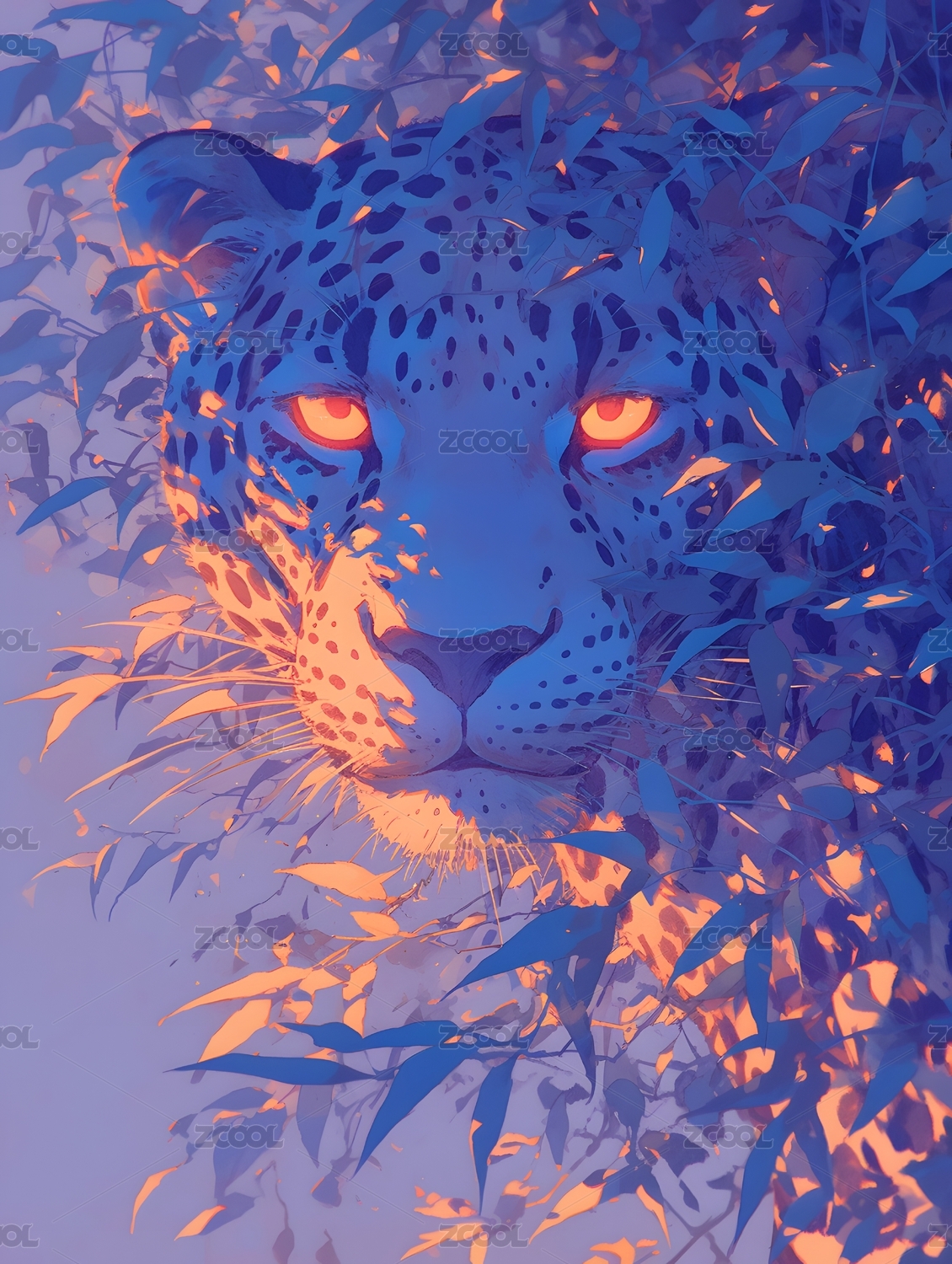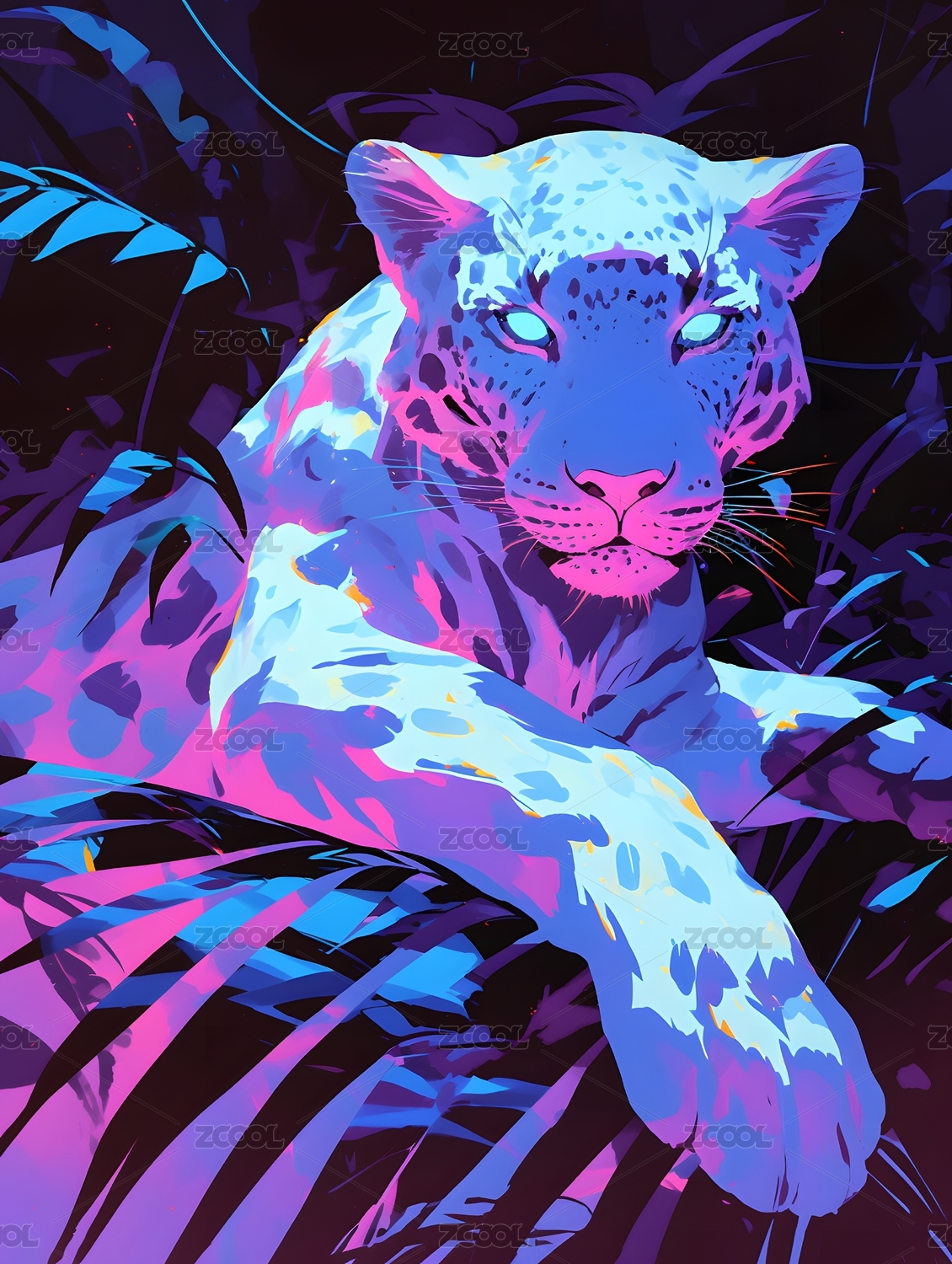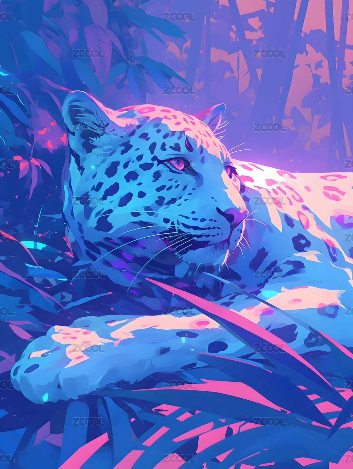 赛博朋克蓝紫色金钱豹在树上的场景插画