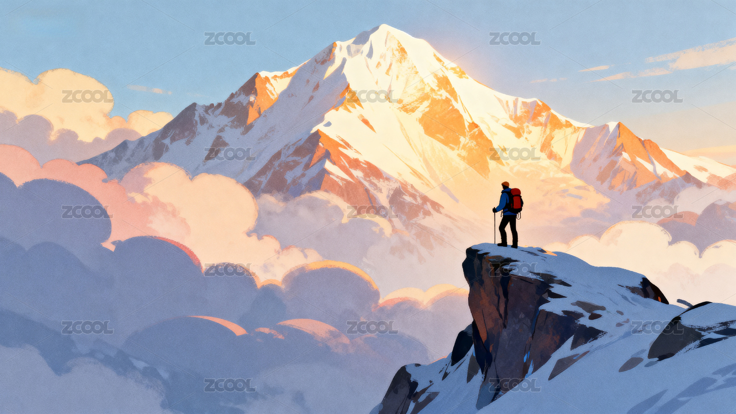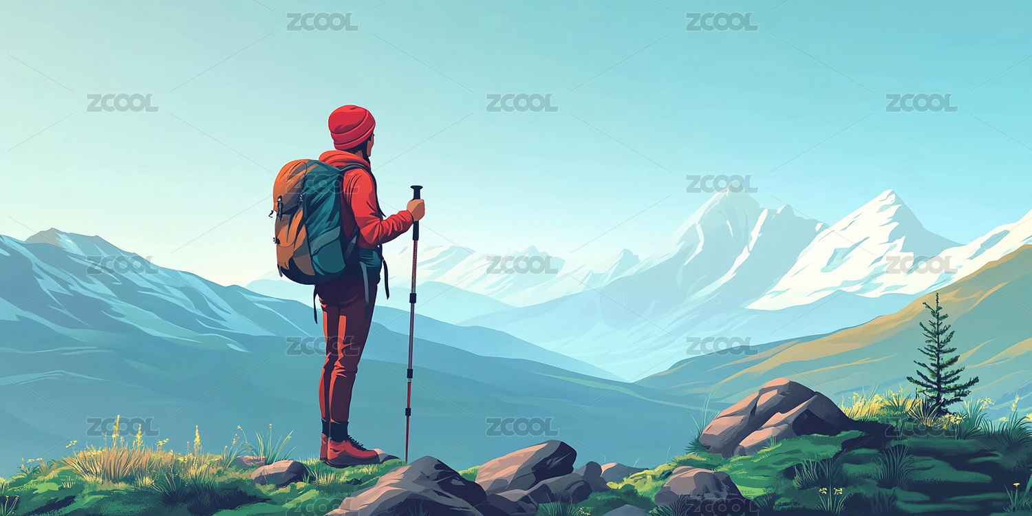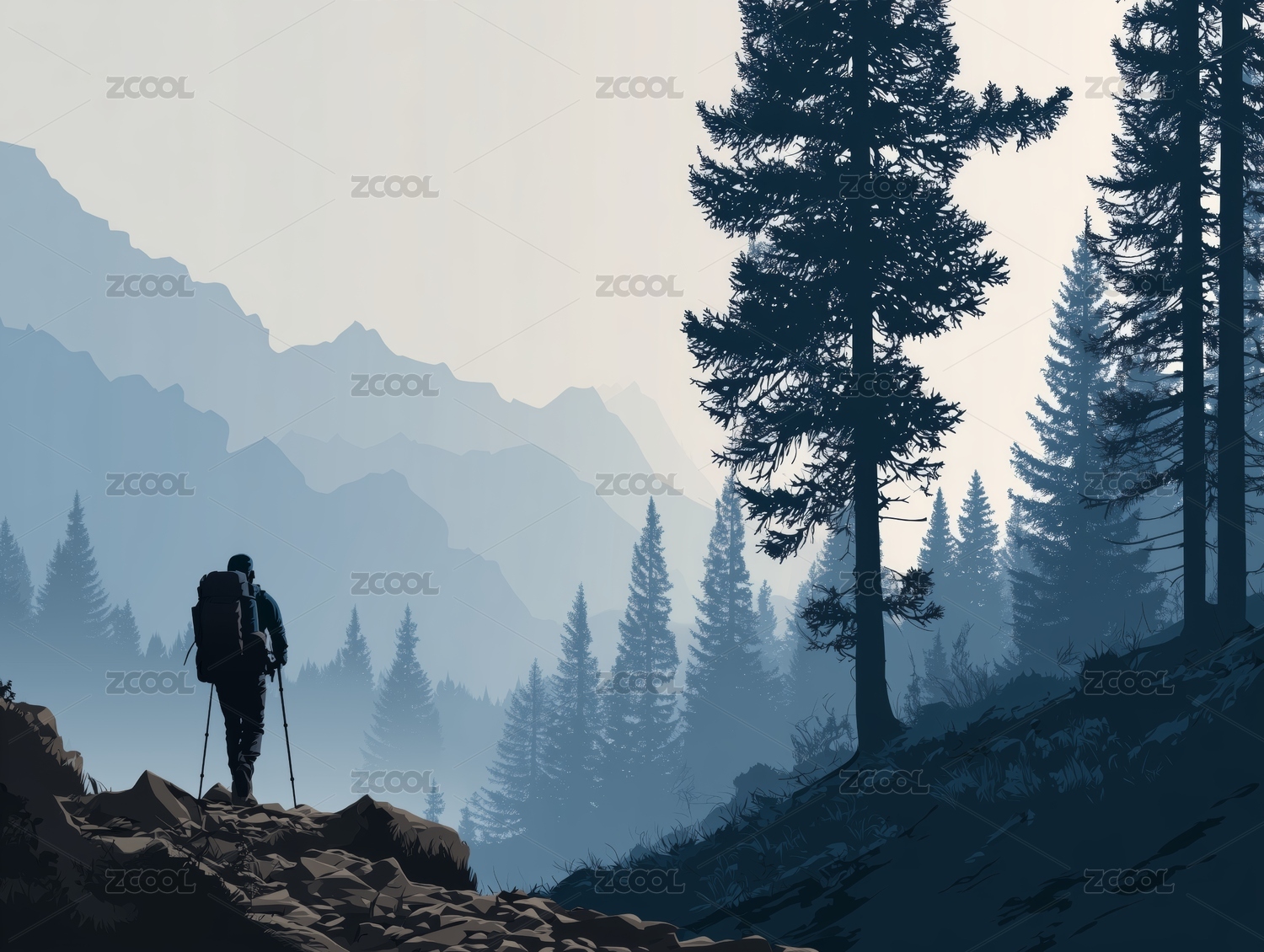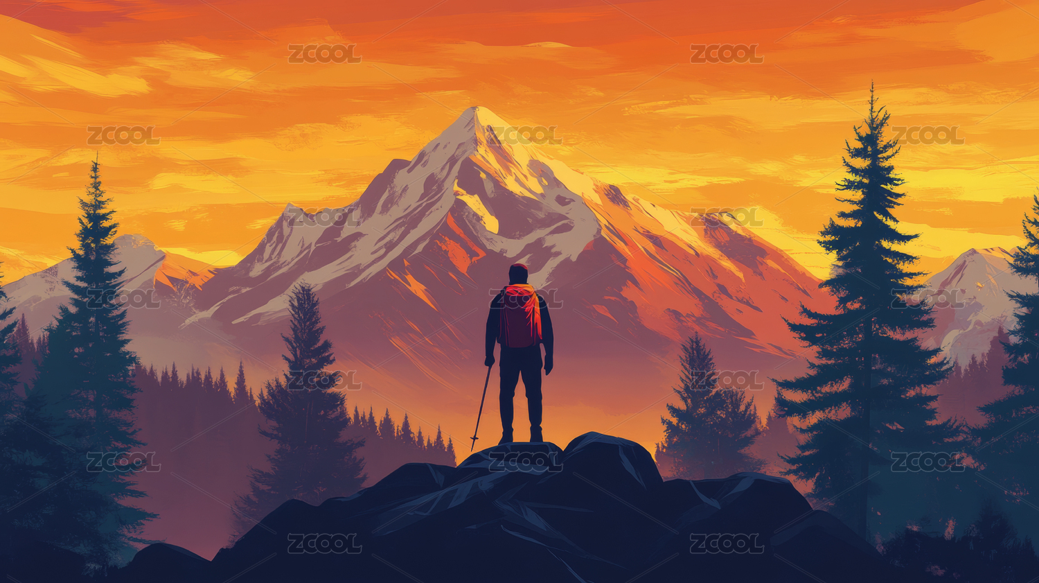 徒步者,夕阳,雪山,远眺,自然,壮丽,山脉,松树,黄昏,探索