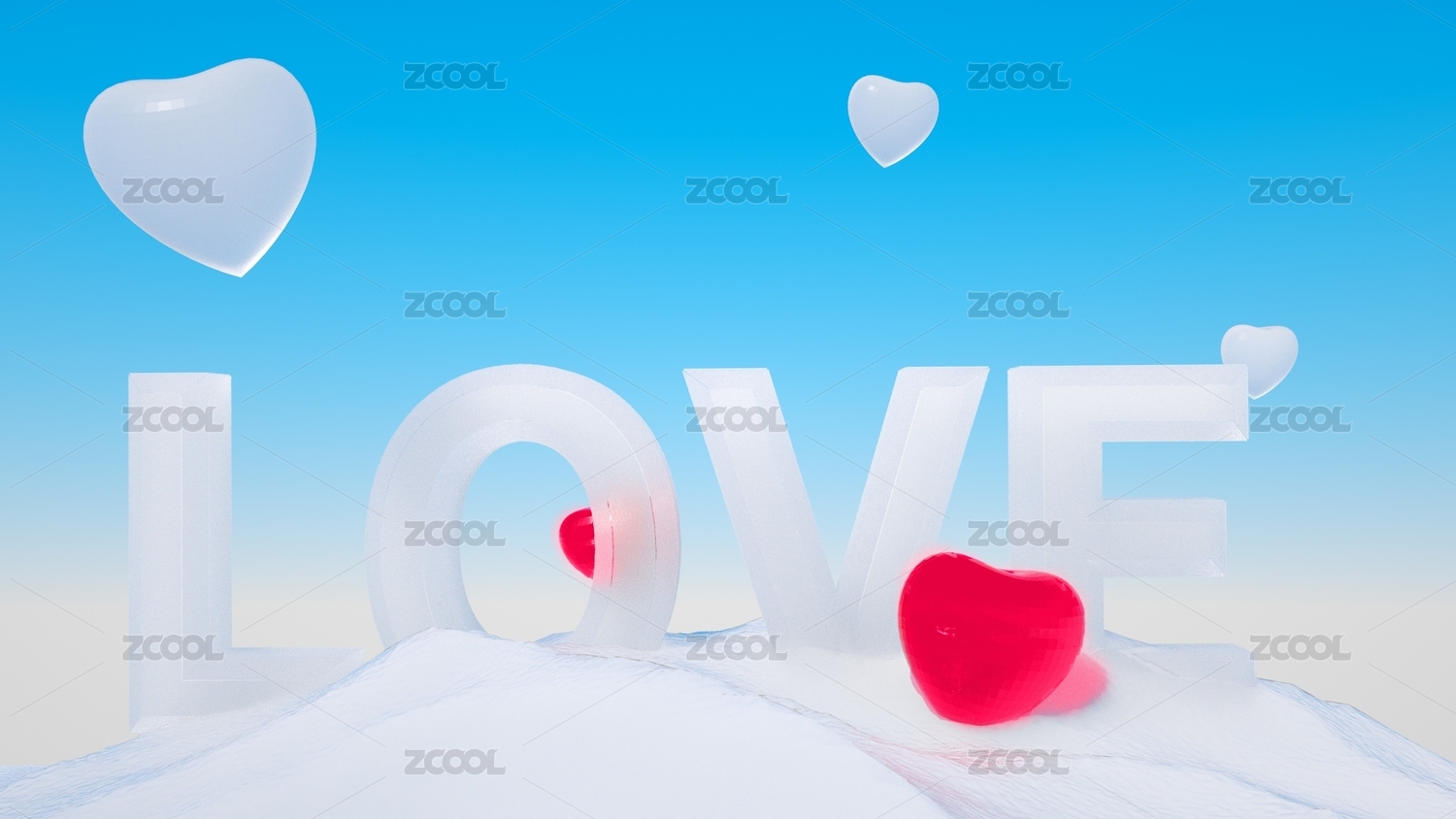 蓝色天空与白色雪地上的红色、白色爱心桃和文字