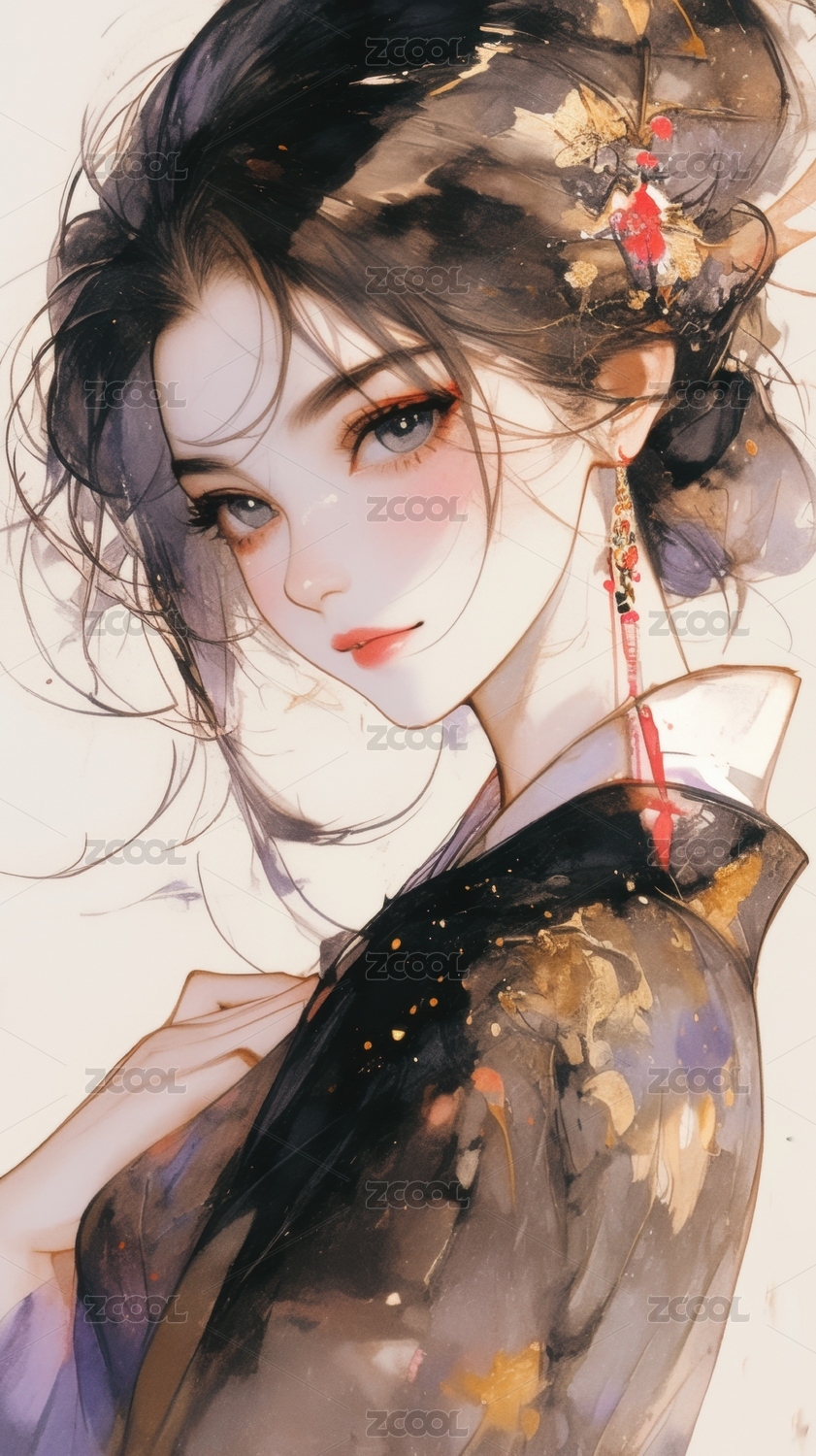 古典美人侧脸华丽服饰与精致发饰