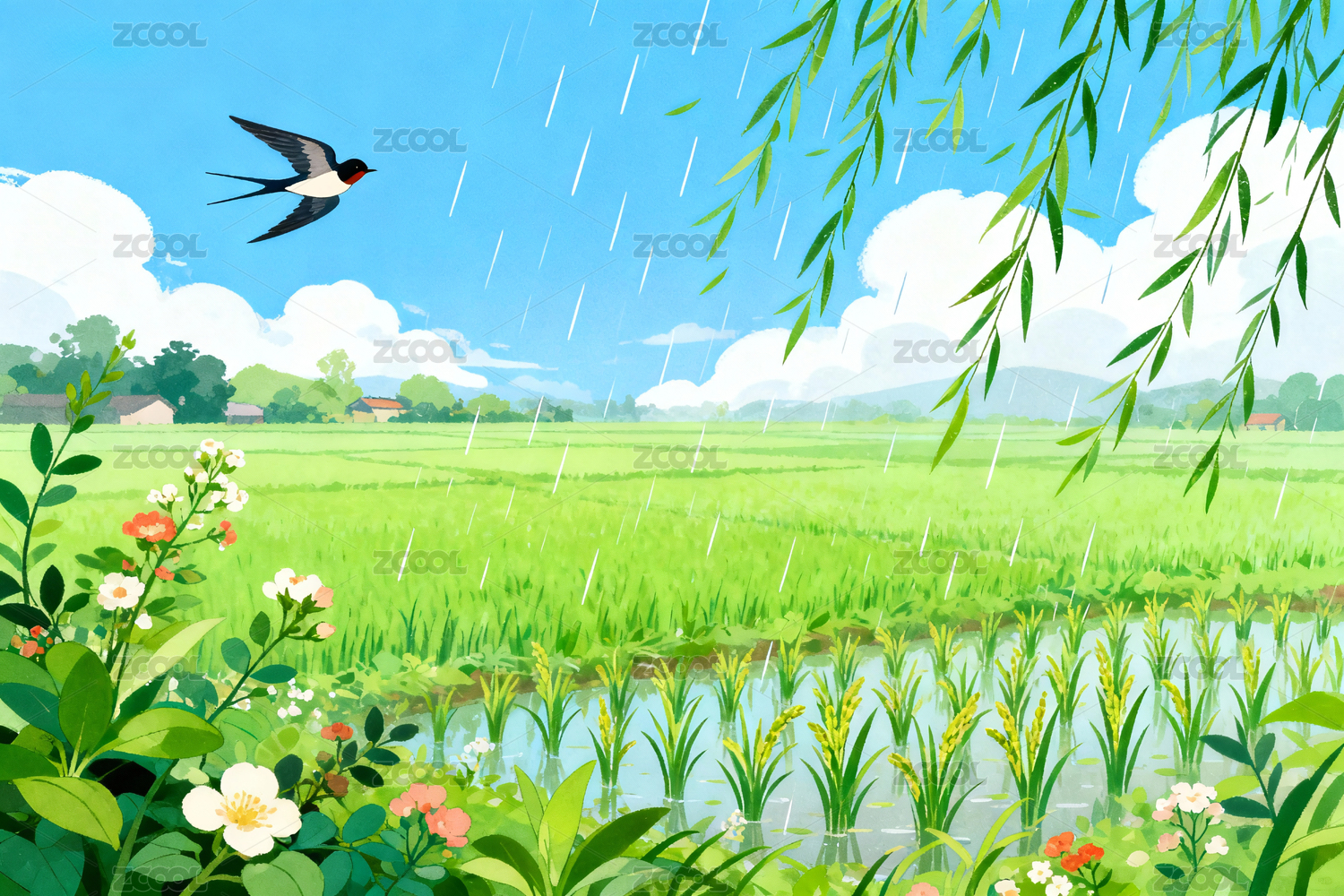 云,插秧,天空,农民,水田,房屋,农田,山,叶子,雨
