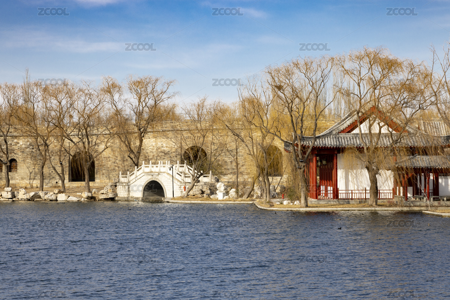 初冬时节碧空映衬下的北京什刹海后海景区风