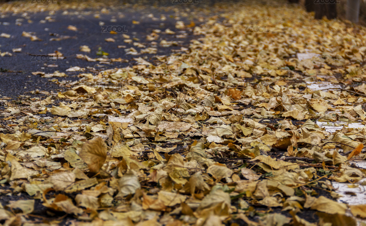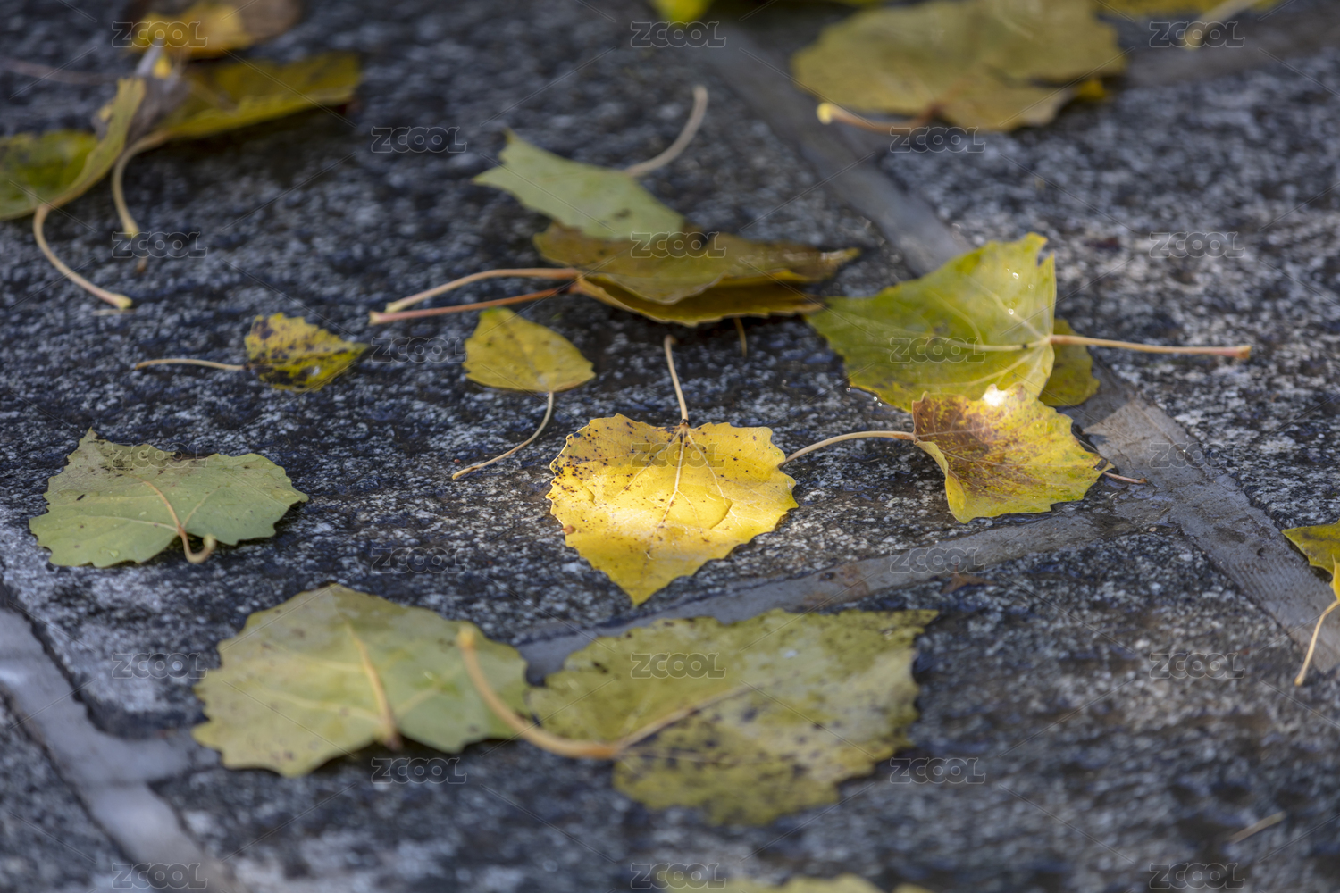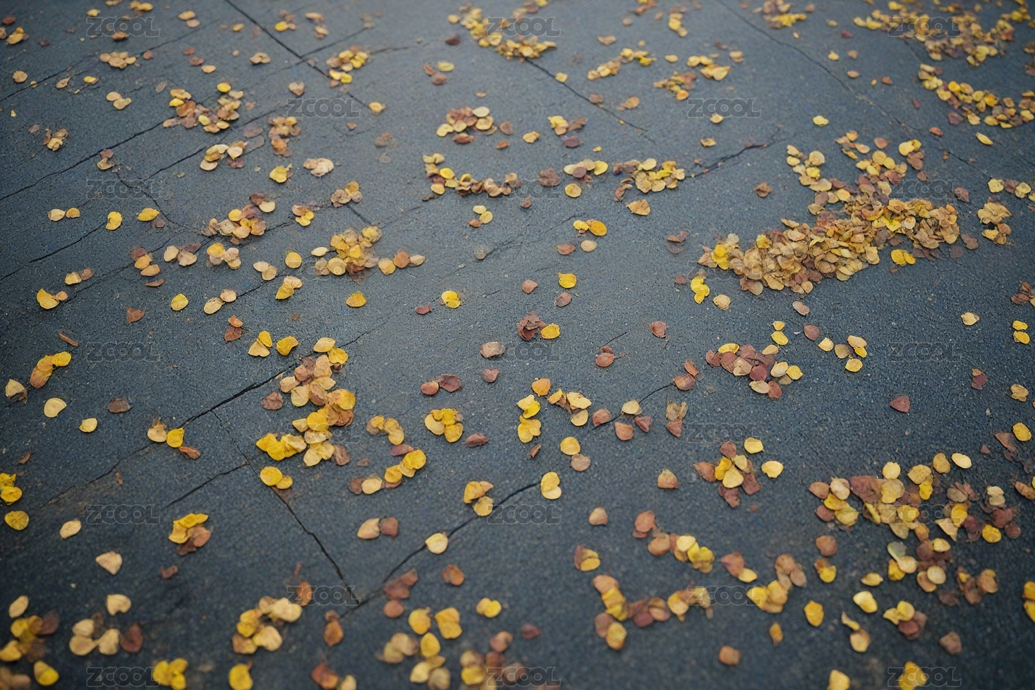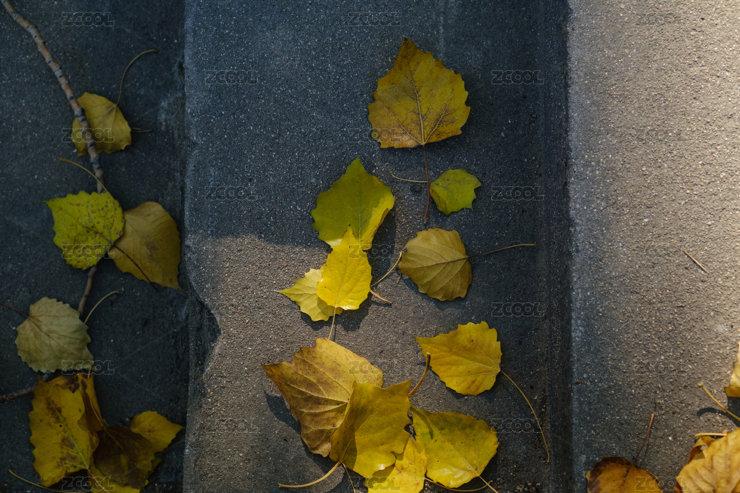 秋季变色脱落的阔叶植物的叶子铺满残破的楼梯