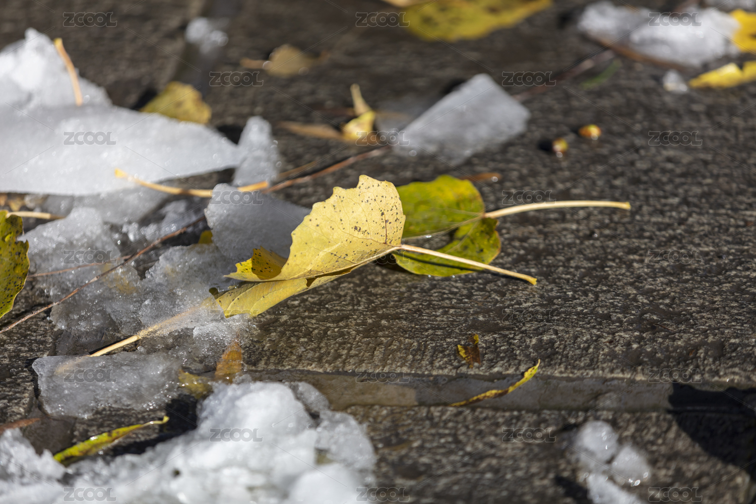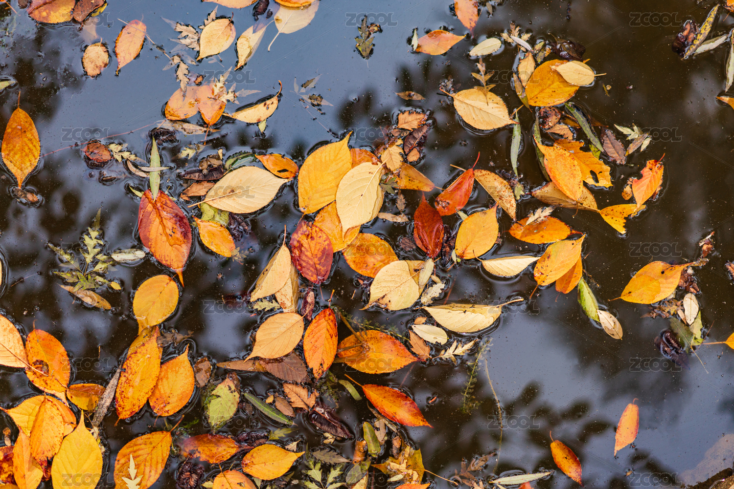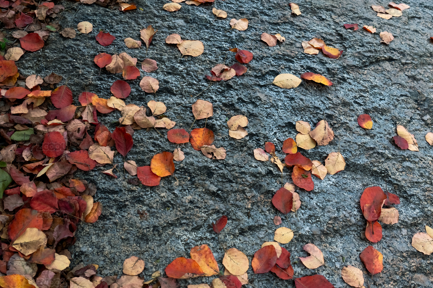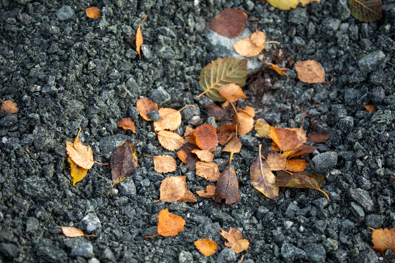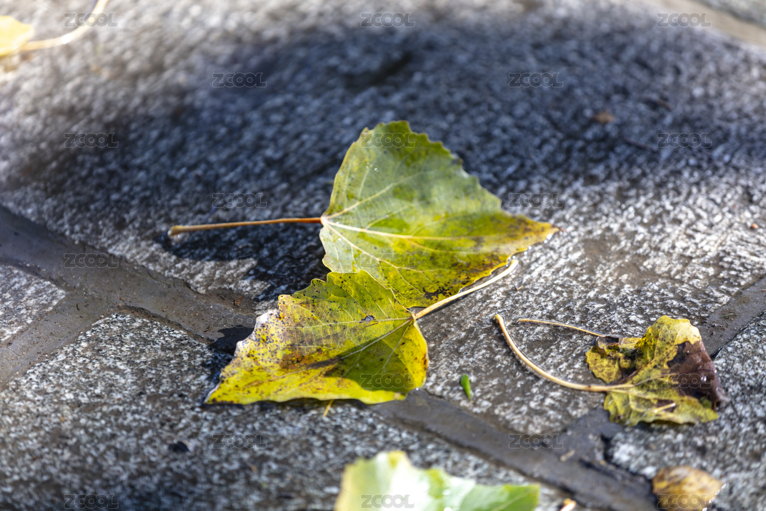 秋季变色脱落的阔叶植物的叶子铺满残破的楼梯