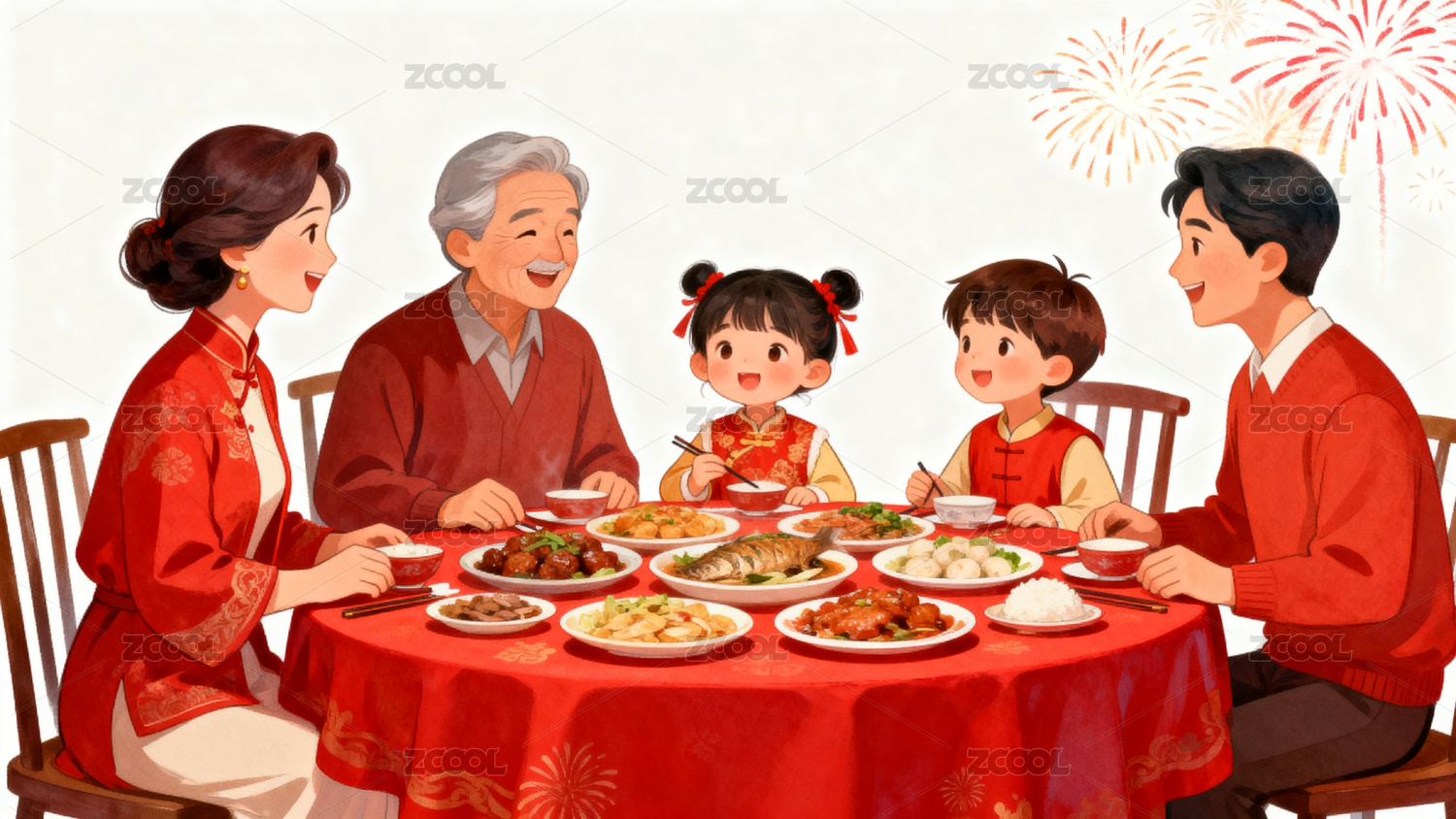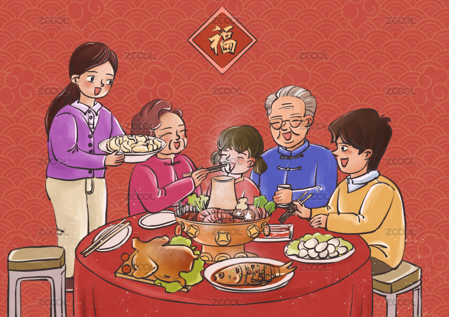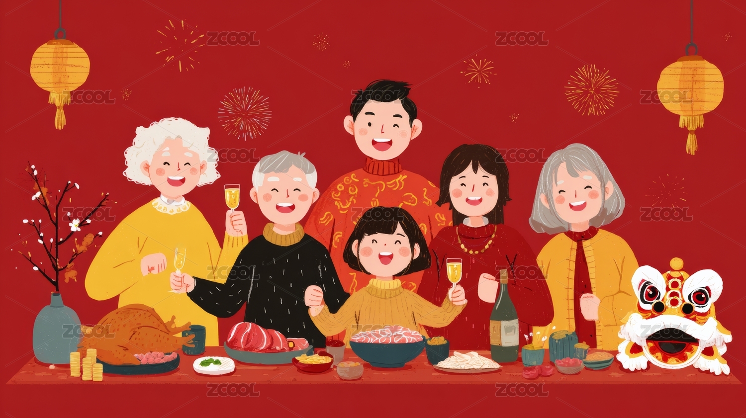装饰,餐桌,老人,小孩,笑容,红色,灯笼,喜庆,传统,食物