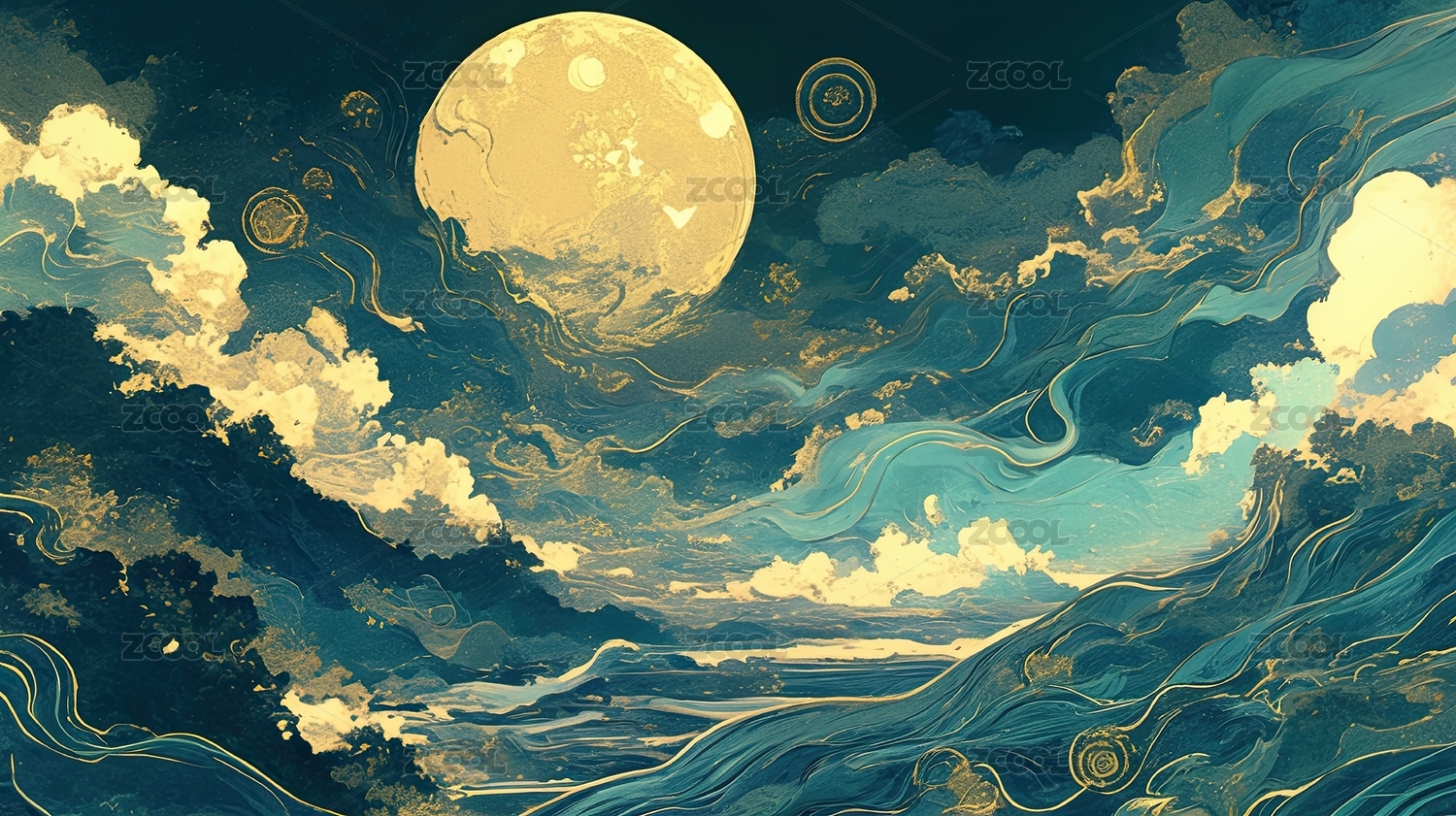 中国风太阳月亮黑金山水云雾背景壁纸新国风