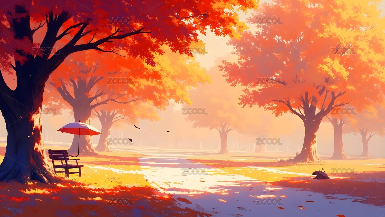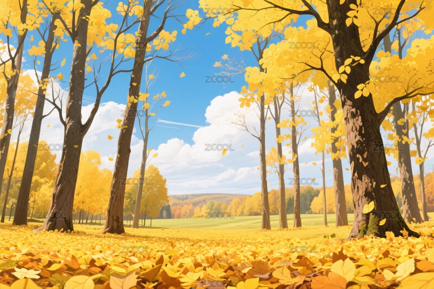 插画,卡通,自然,树木,风景,环境,户外,阳光,和谐,乡村