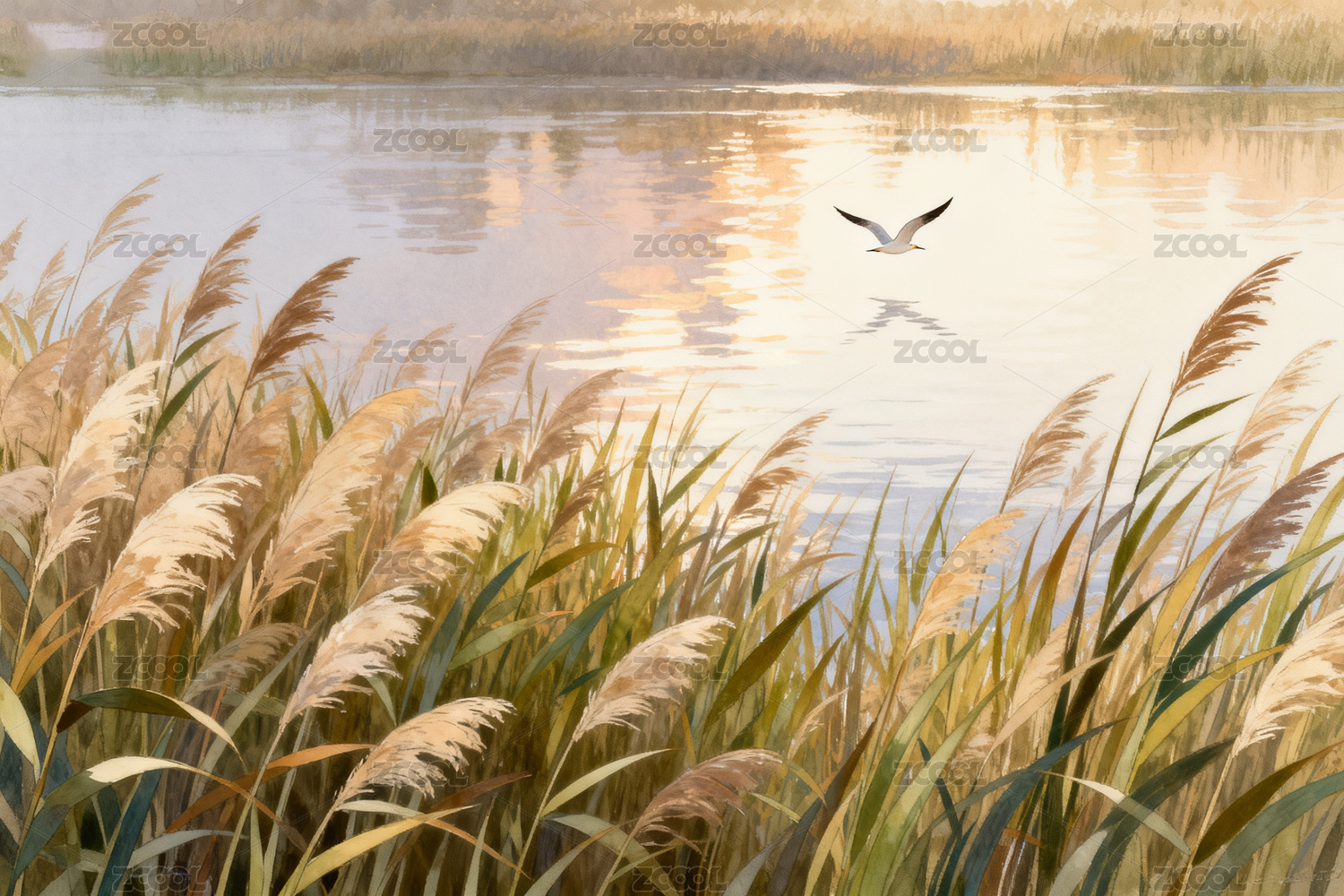 水边摇曳的金色蒲苇
