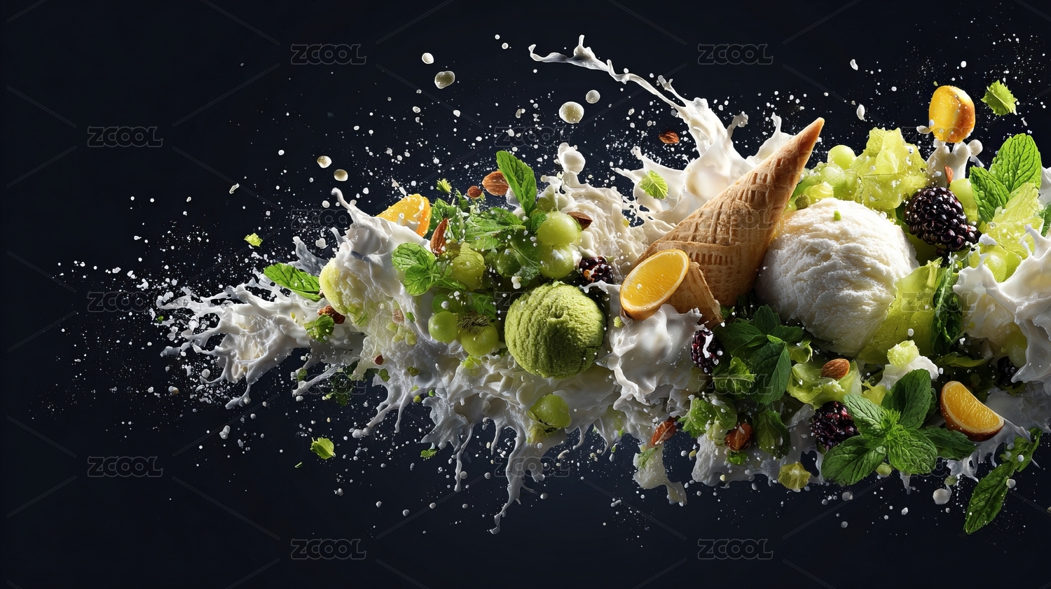 黑底鲜艳的果汁飞溅的水果冰淇凌3D插画