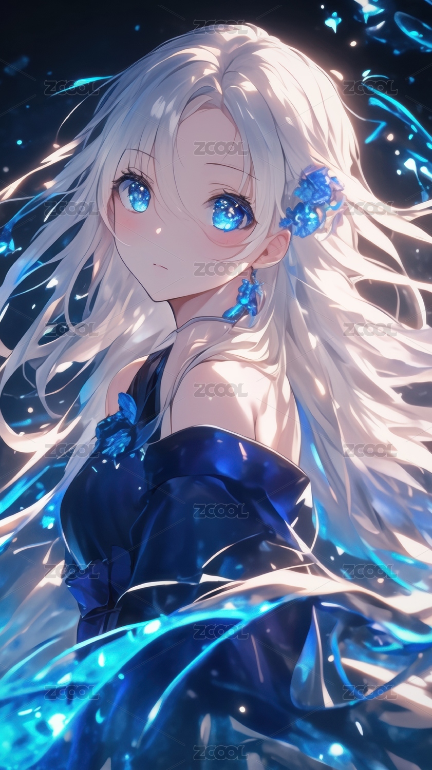 蓝发少女身着轻盈蓝裙背景星光闪烁