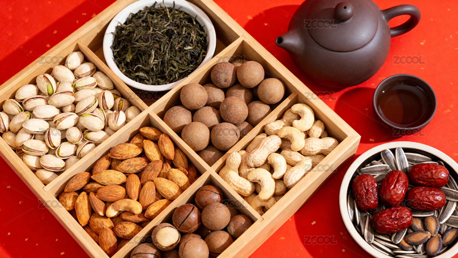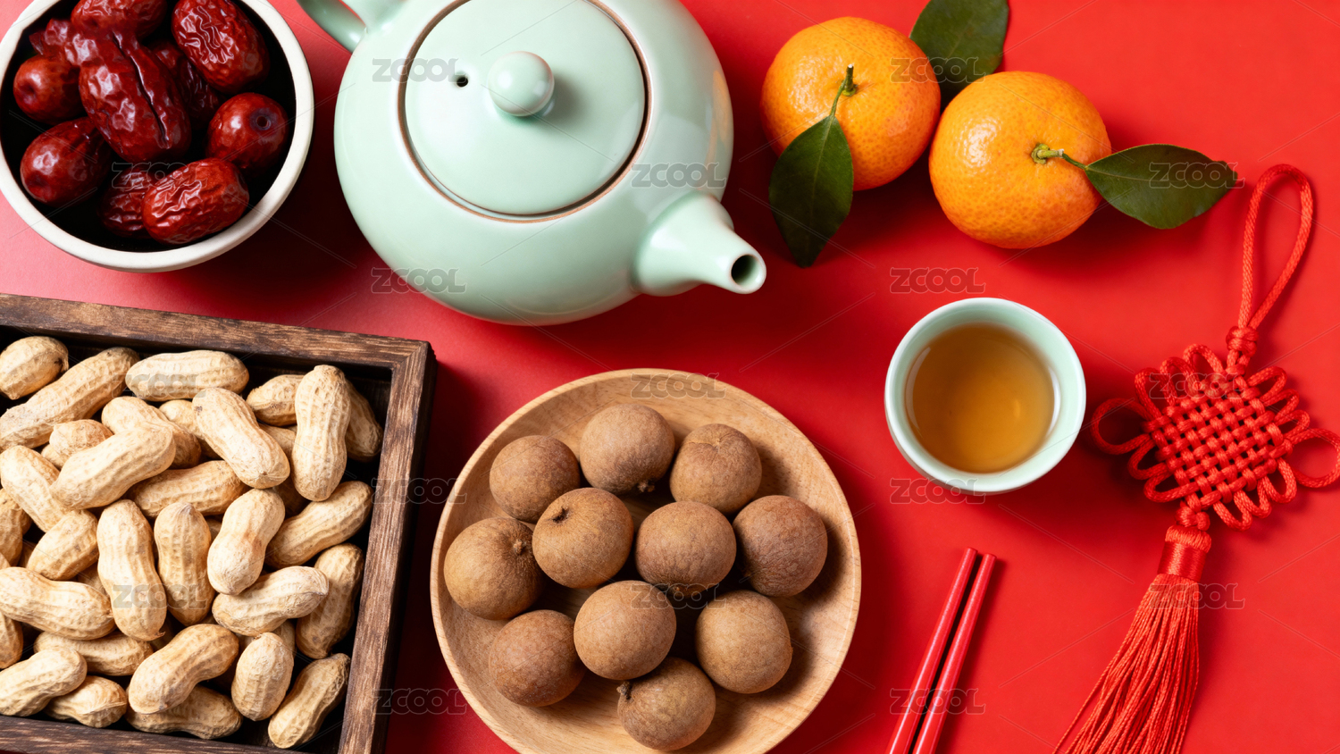 摆着红色背景上的茶盘茶具旁边还放着装有坚果的果盘及对联红包