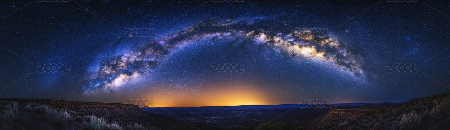 荒漠中一棵枯树的上空横贯着一片绚丽的星云