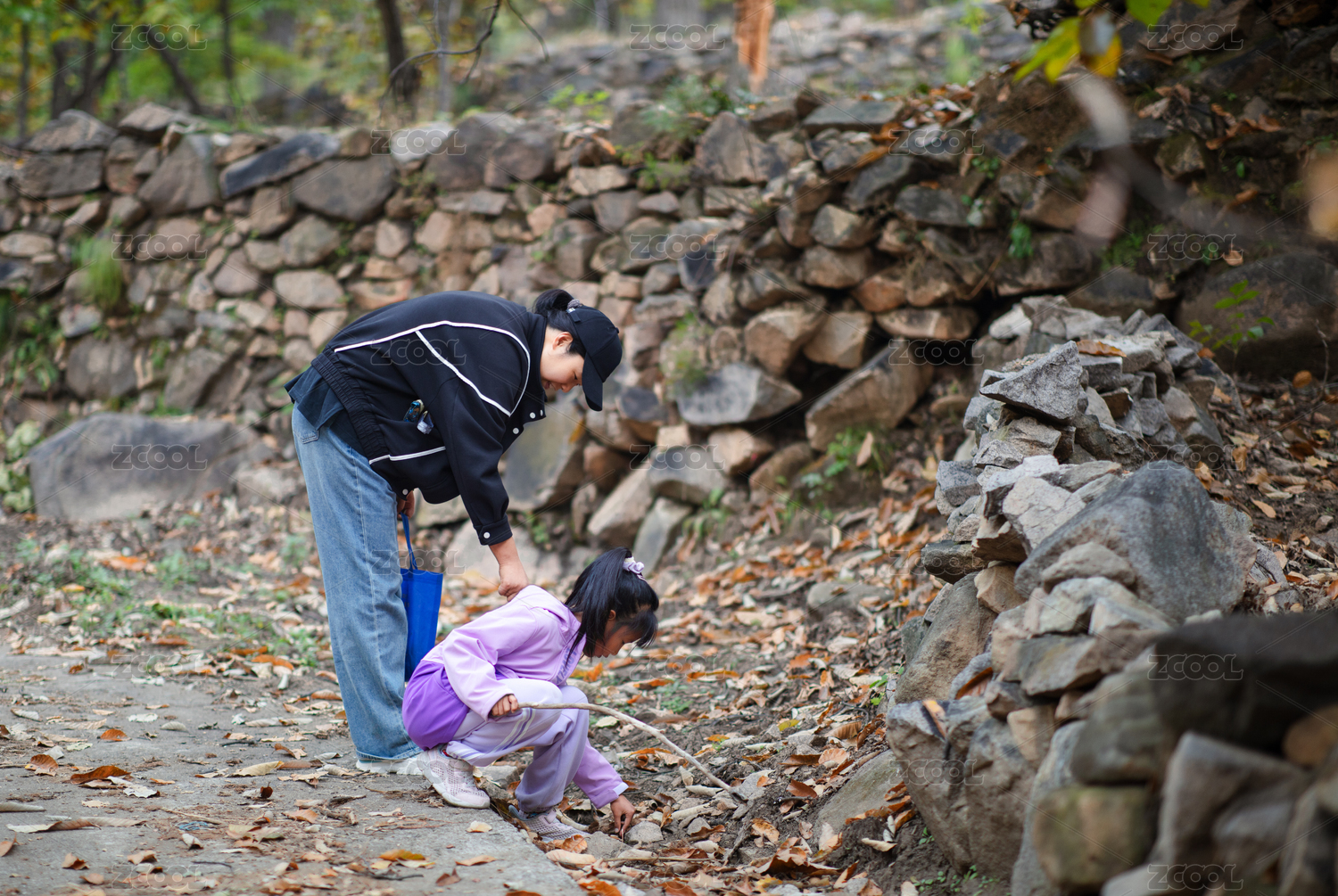 奶奶带着孙女户外寻找板栗