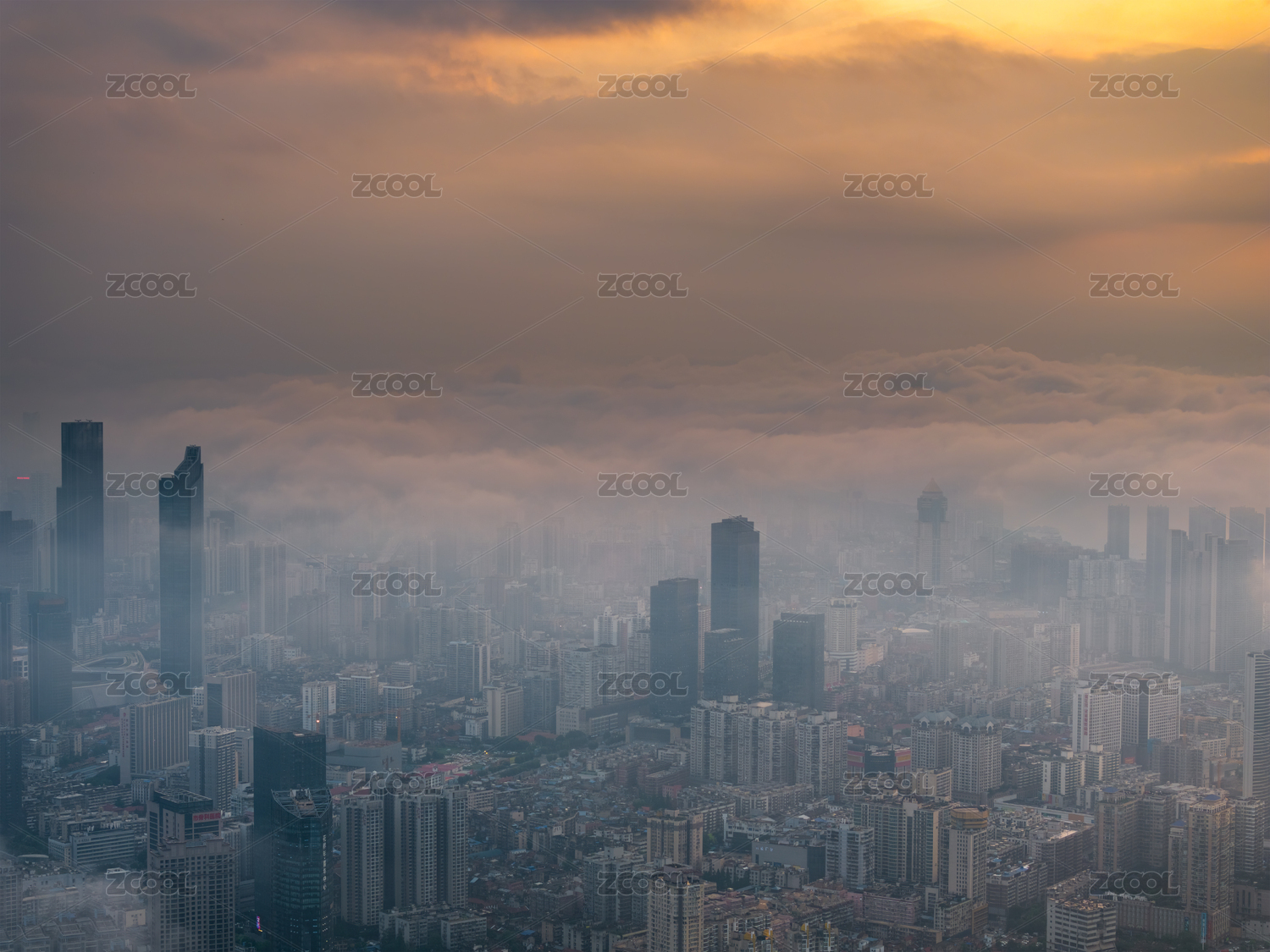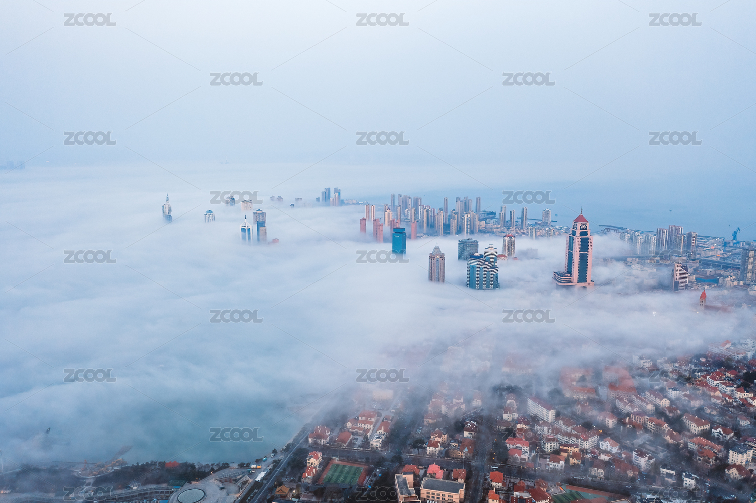 日落时平流雾笼罩的青岛城市