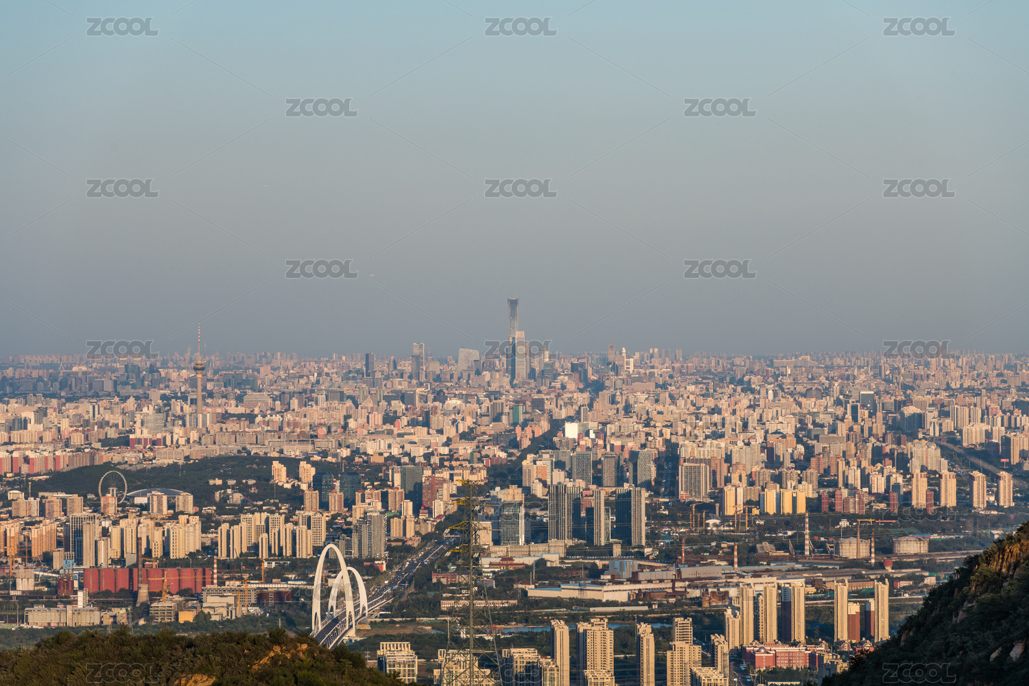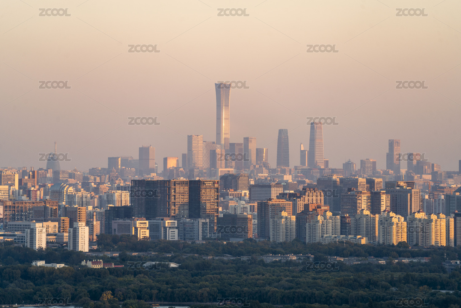 俯瞰黄昏金光中的北京繁华城市密集建筑群