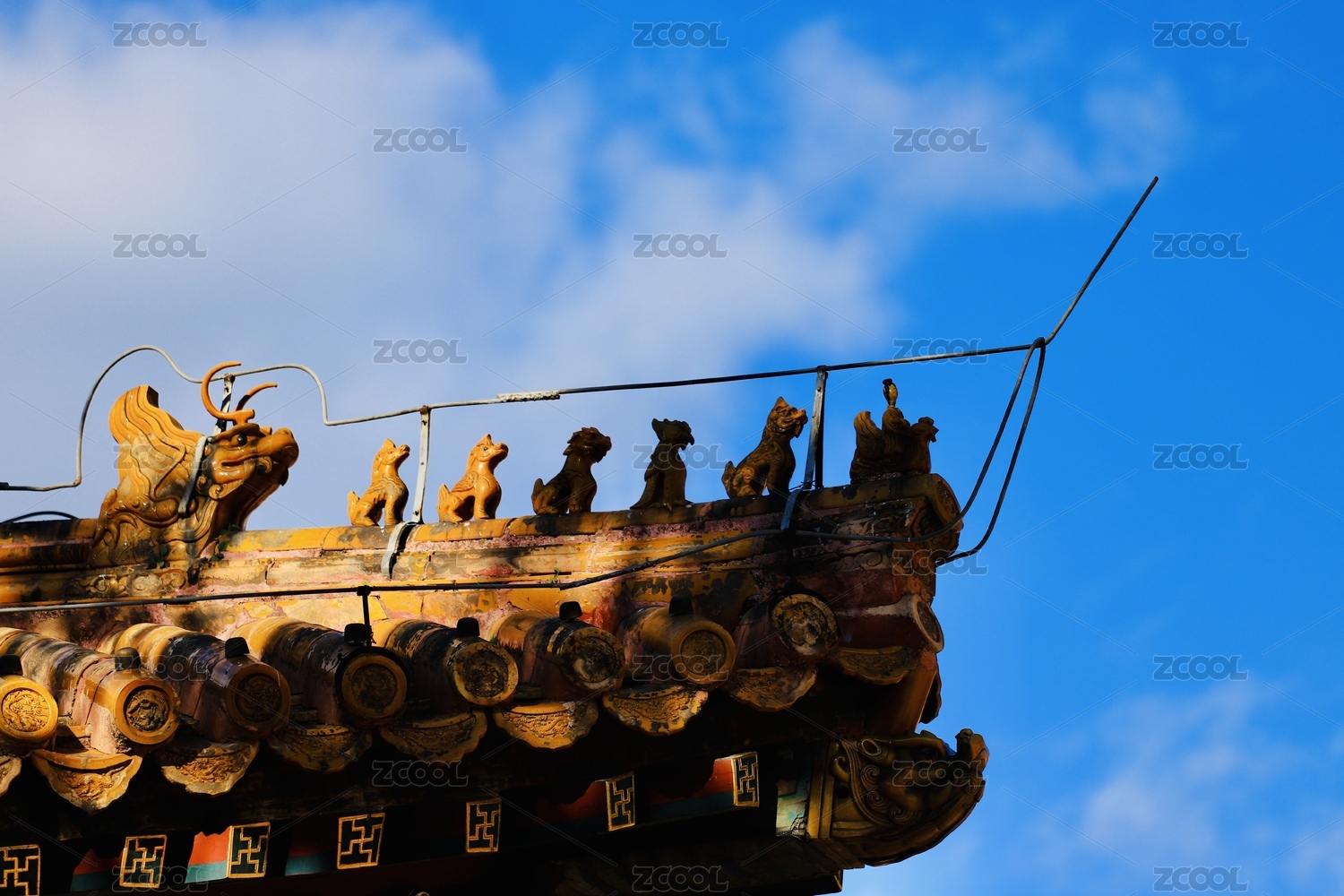 蓝天白云下中式古建筑屋顶神兽特写