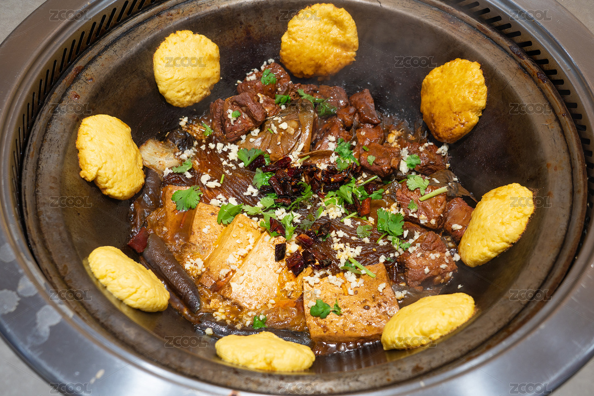 铁锅炖,牛肉,豆腐,贴饼,香菜,辣椒,食材,美食,炖煮,菜肴