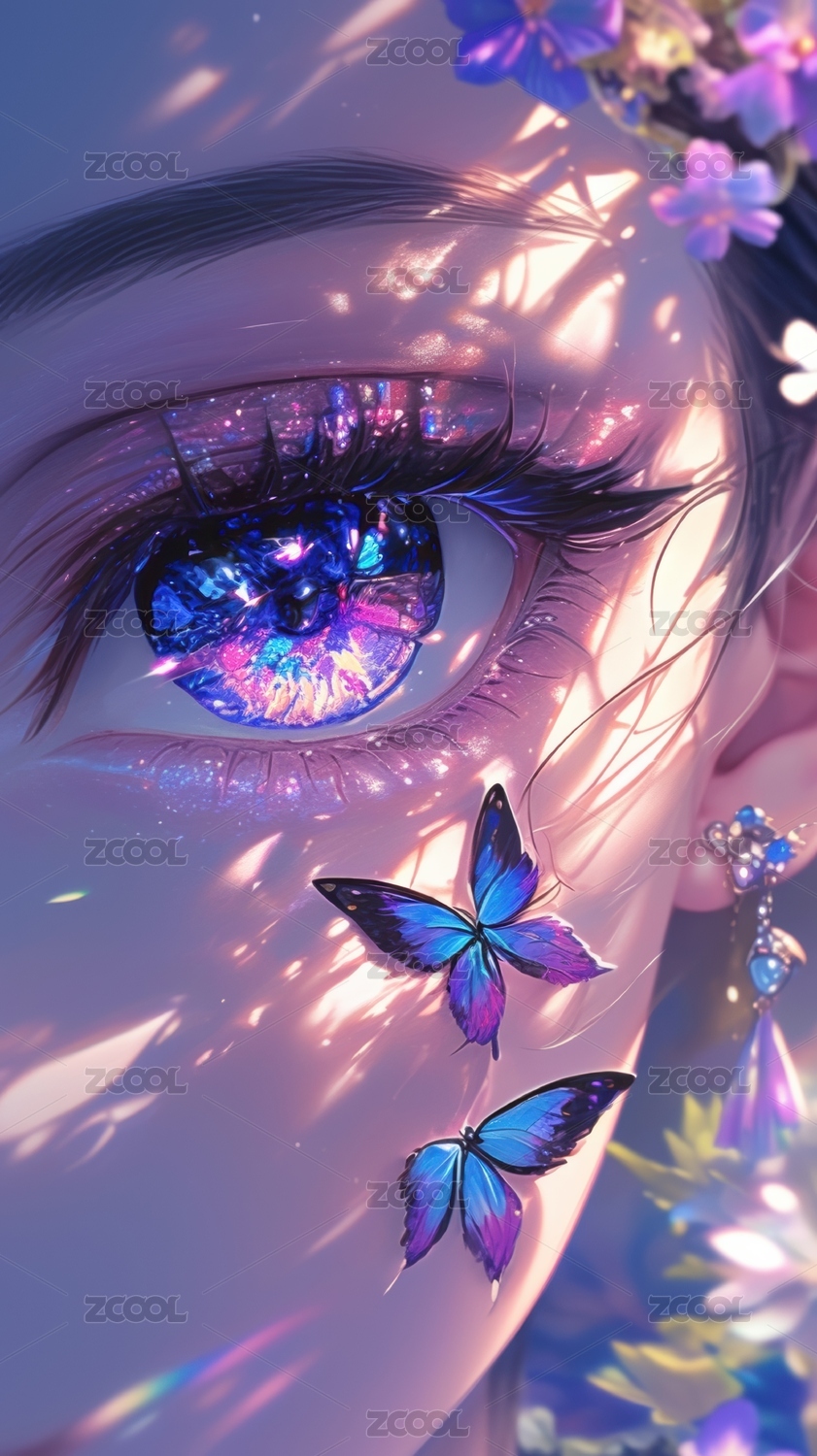 梦幻蝴蝶与紫色花朵环绕的眼眸