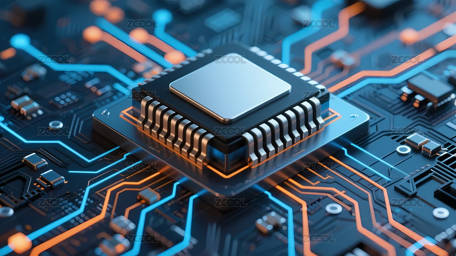 黑色芯片与蓝色电路线条