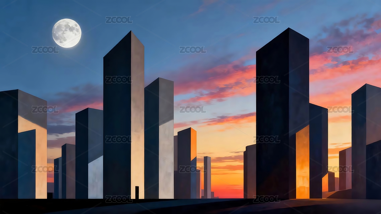 满月高悬城市夜空建筑剪影