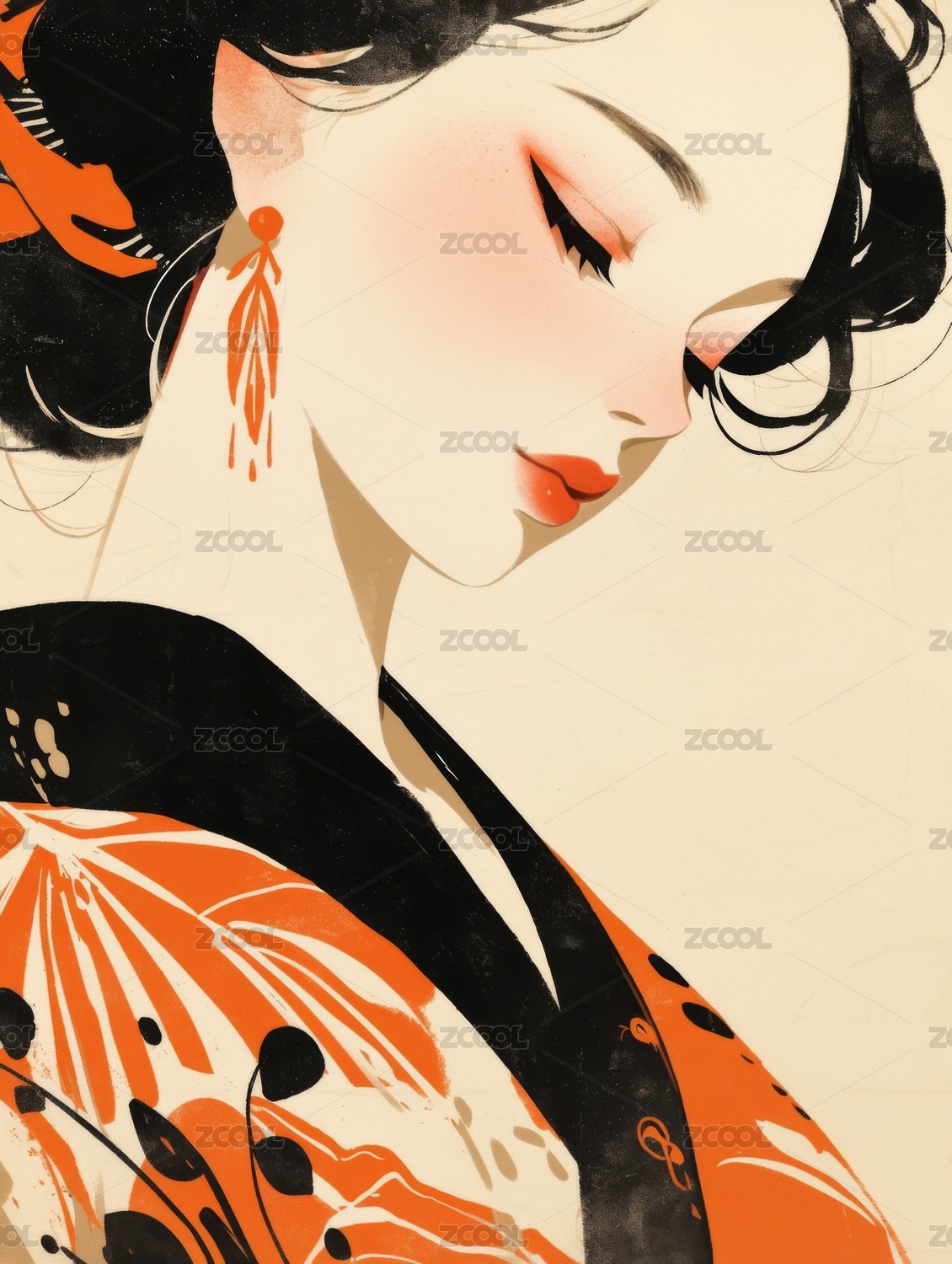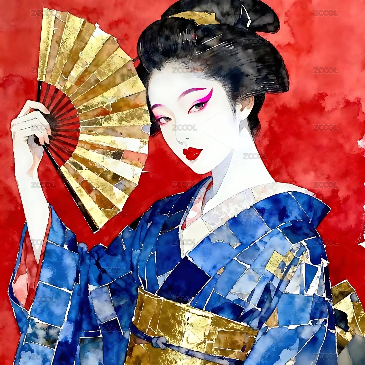 日式,艺伎,折扇,金箔,和服,蓝色,红色,妆容,发饰,发髻