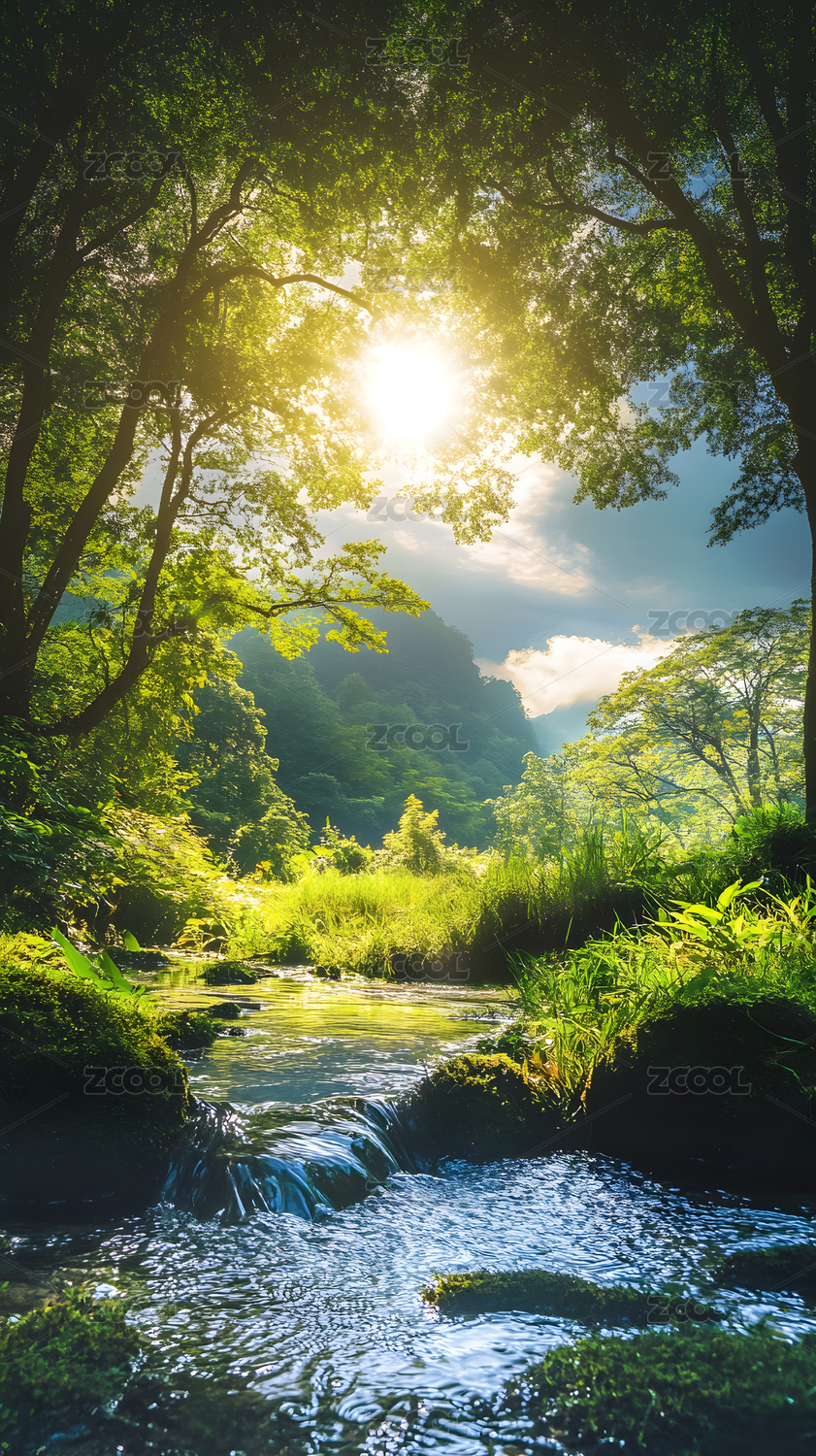 森林溪流日出阳光