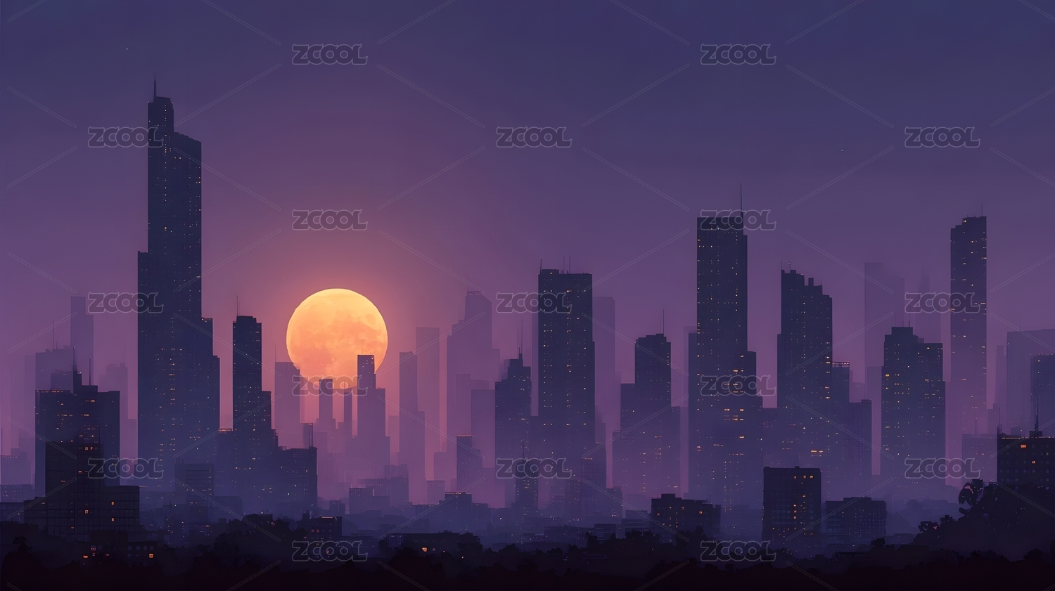 紫色,城市,夜景,渐变,深蓝,高楼,剪影,满月,夜空,轮廓